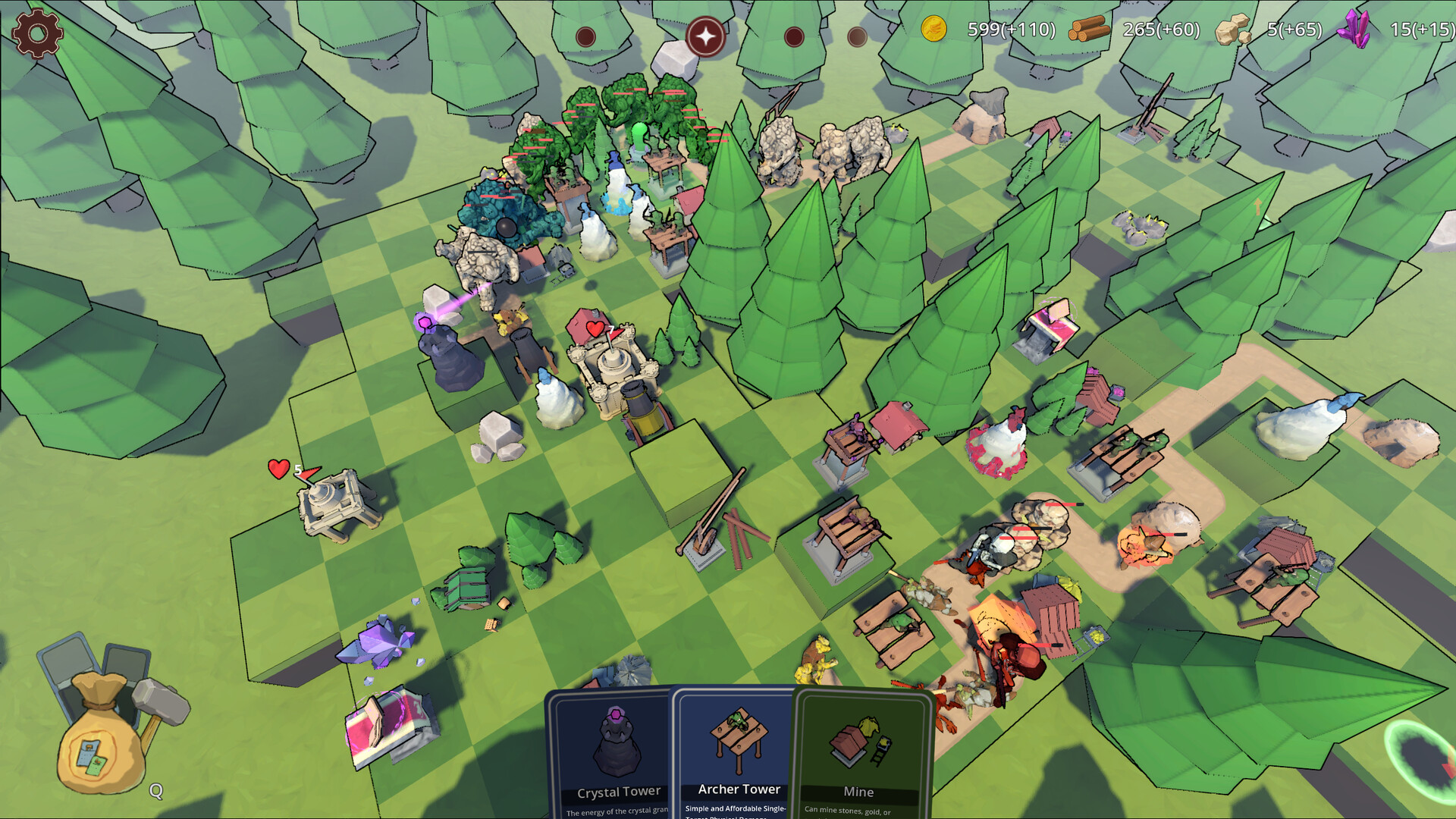 Resources are the core of strategy. Building and upgrading towers requires materials, and purchasing cards requires gold. Everything is interconnected — you must gather, deploy, and manage efficiently to establish a functioning system on the board.