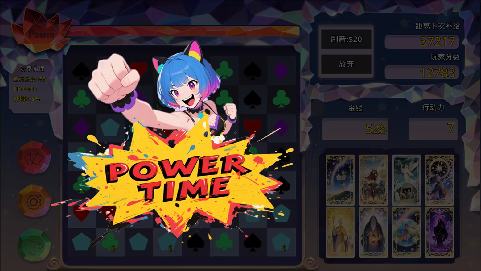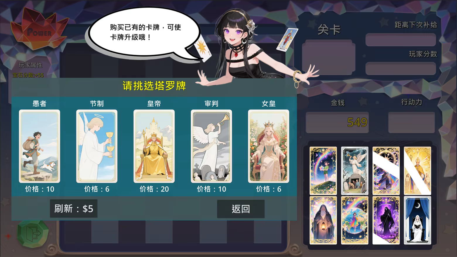 在妙趣横生的三消挑战中赚取金钱,前往商店从22张功能各异的塔罗牌中精心挑选。每一张塔罗牌都拥有3个可升级等级,丰富的组合将催生出无穷无尽的战术流派,让您的每一局游戏都充满新鲜感。