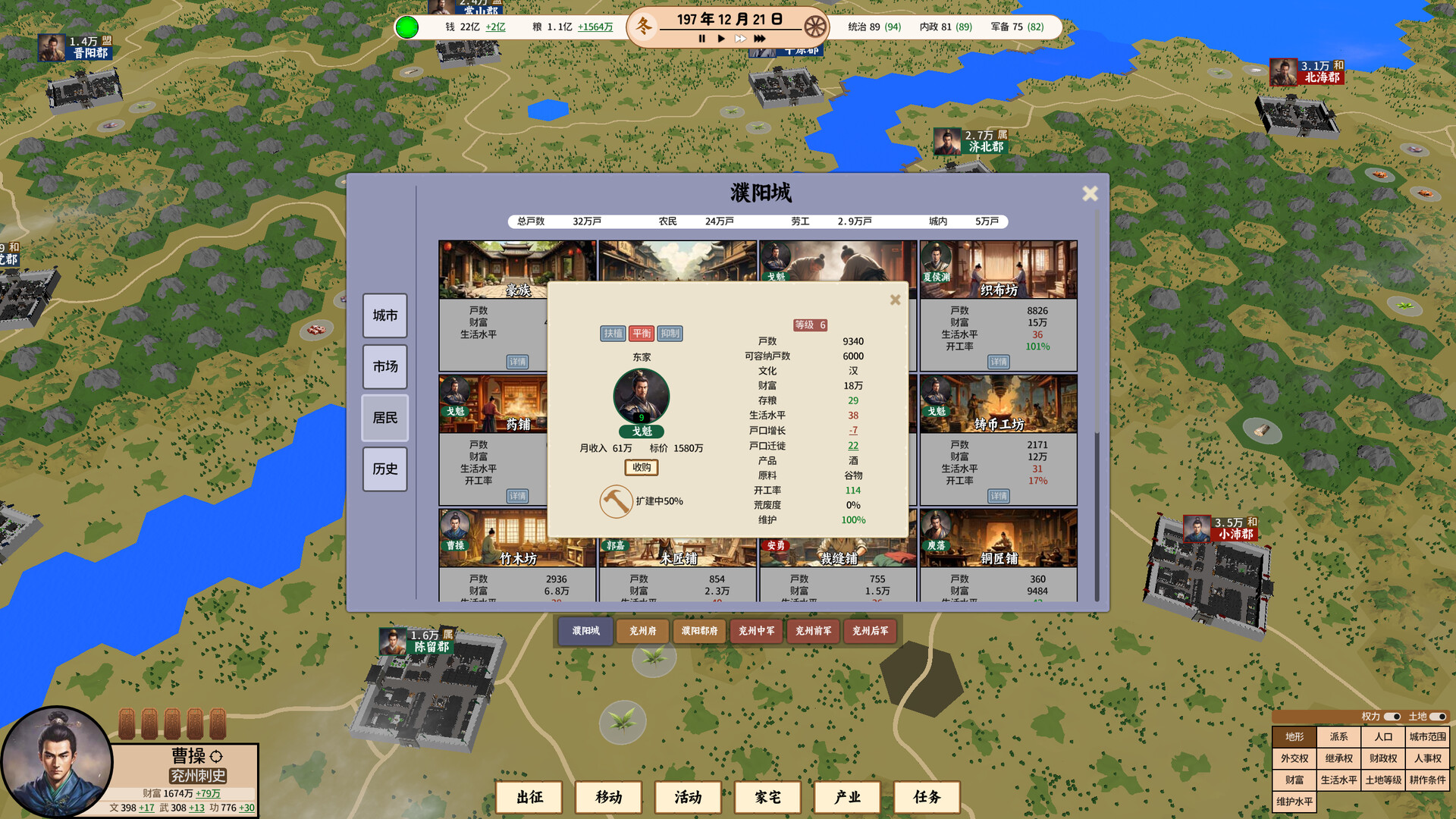 POP(即人群)是构成人口的基本单元。从粮食、盐到兵器,所有的物资均由POP生产;所有的兵员均需从POP中招募;所有的税收向POP征收。