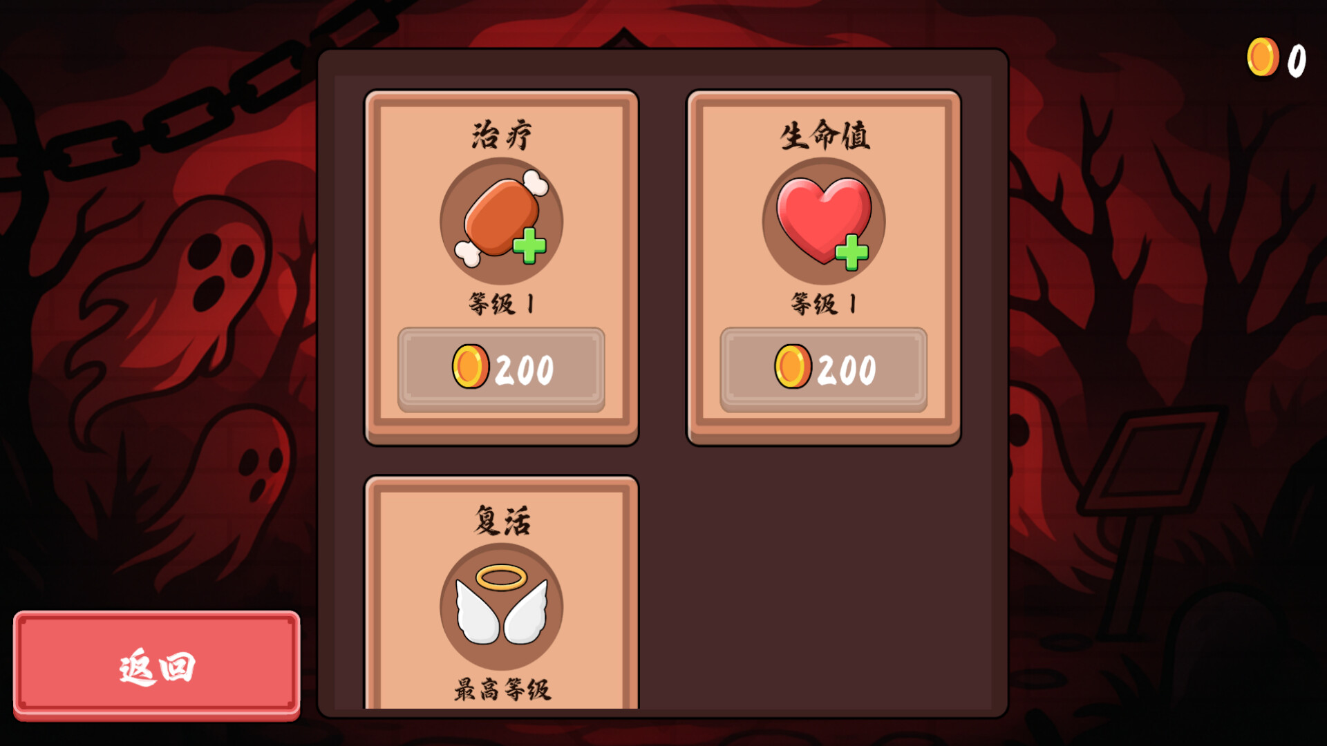 角色升級:遊戲內設有商店,玩家可在商店中(滑鼠下拉)購買不同屬性道具,如防禦、攻擊、治療、生命值、復活等。