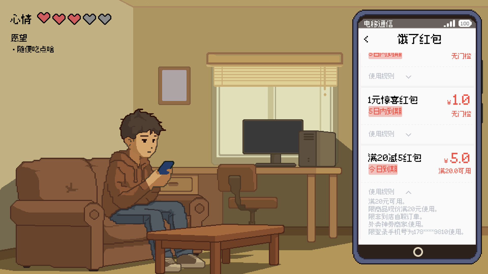 工资提前花光,距离发薪日还有整整一个月。打开手机,精打细算,利用好每一张外卖折扣券。你能撑到下一个发薪日吗?