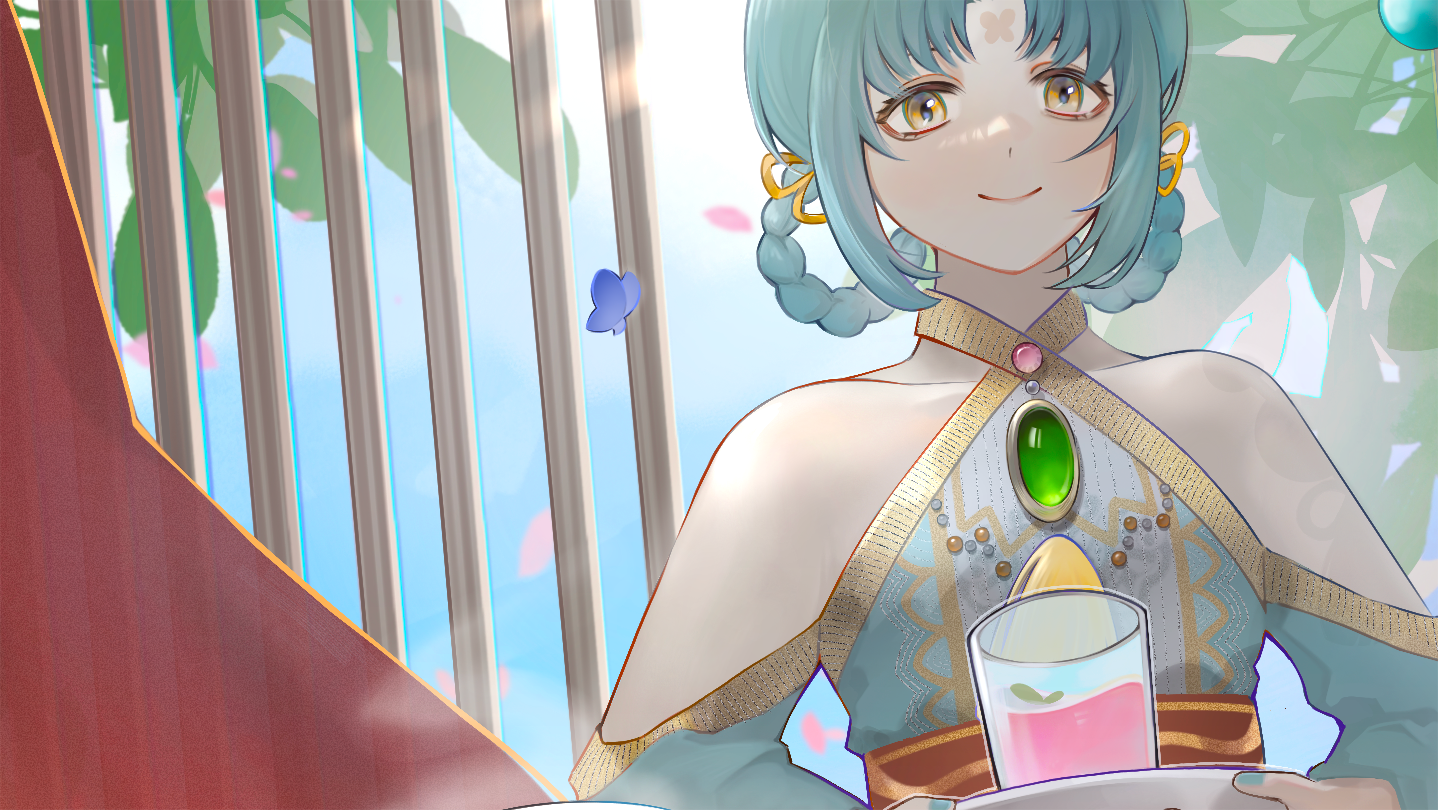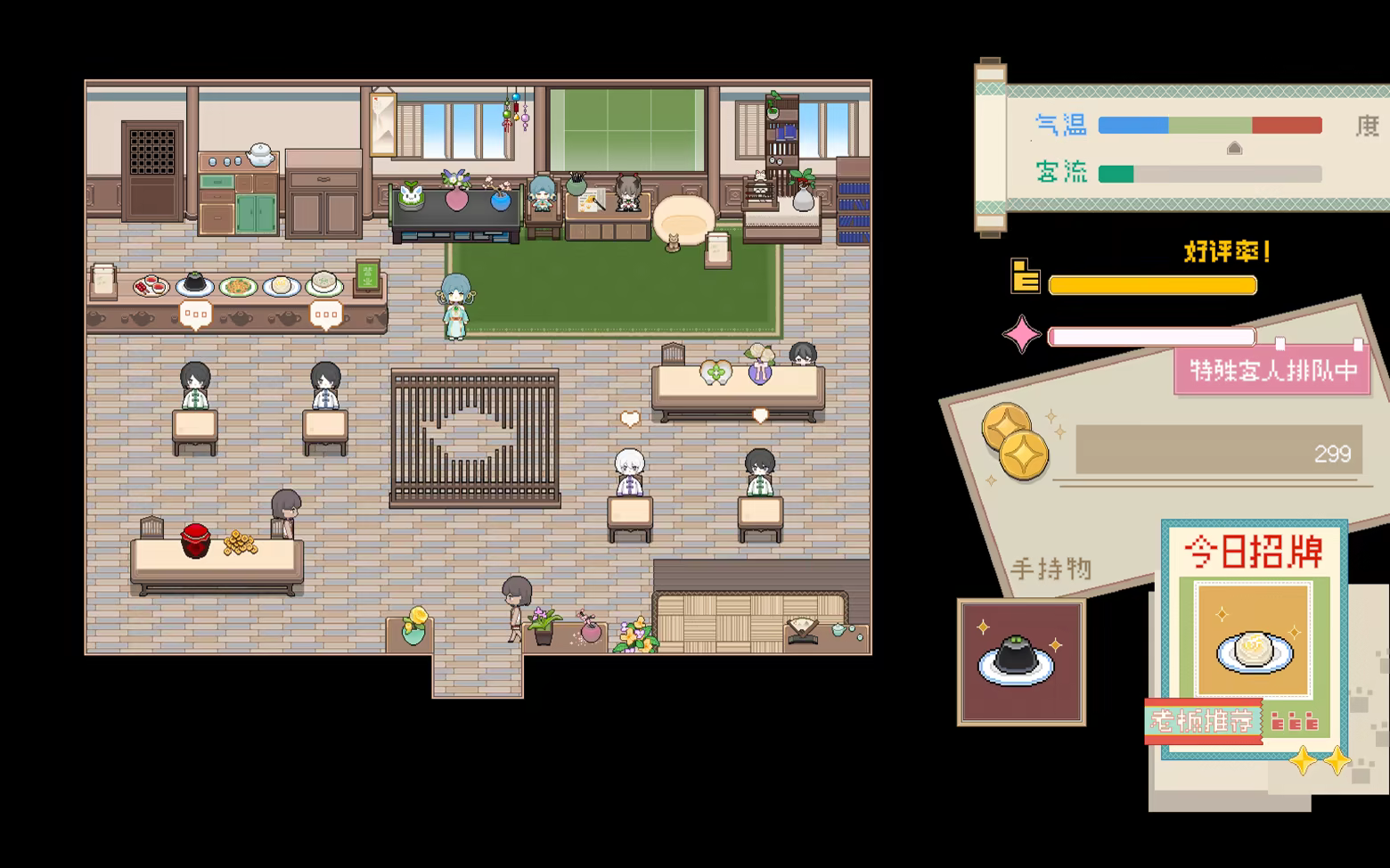 Welcome to Lakeside Teahouse! You play as a cursed girl who must manage a teahouse while uncovering secrets about the curse and the past. :D