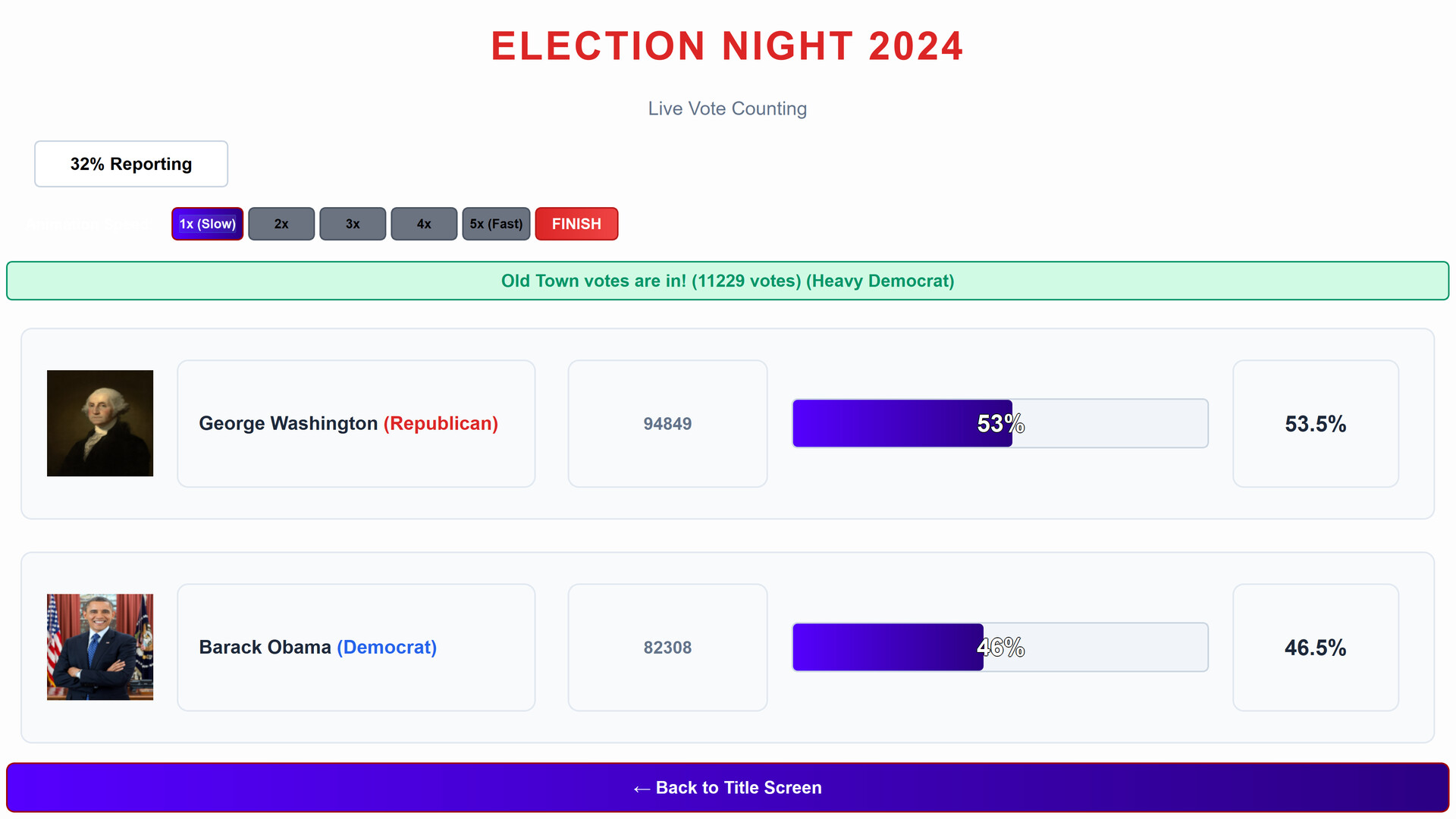 Ever wanted a easy to use and customize political game? You've found it. I have tried to allow the user to have as much control as possible. You can create any candidates and opponents you want, you can customize the amount of voters from 10 voters to 25,000,000 (More on that later), the party composition of the voters, and the demographics of your voters.