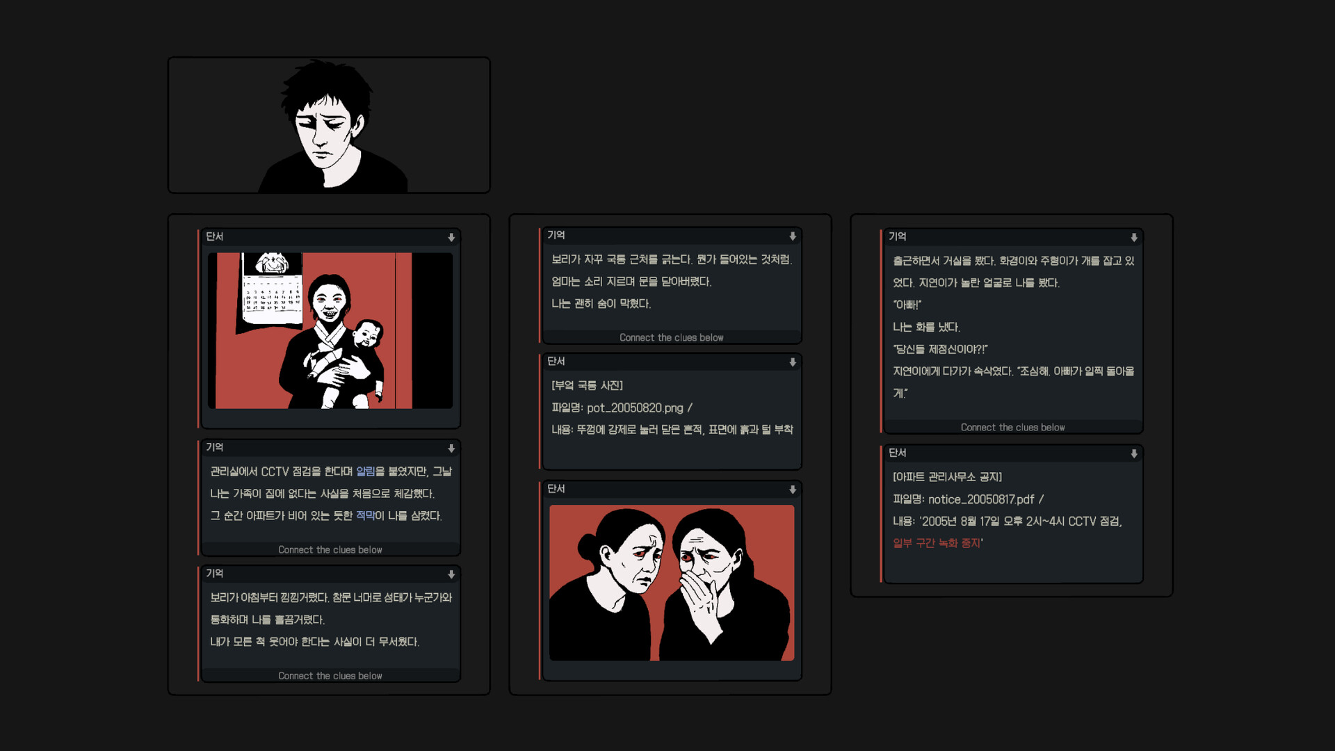 당신은 서로 다른 인물들의 파편화된 기억과 남겨진 단서를 조합해 진실에 다가가야 한다.