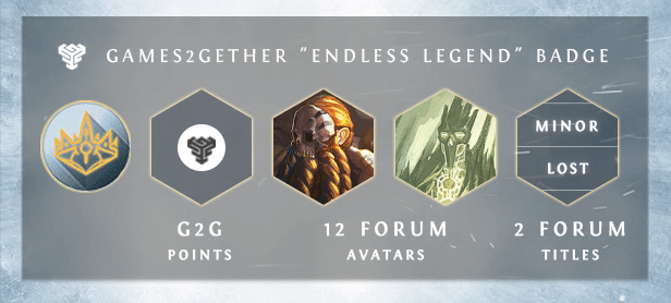 Join the GAMES2GETHER community now, and receive the Endless Legend badge (unlocks points, dozens of avatars and titles to customize your GAMES2GETHER profile)