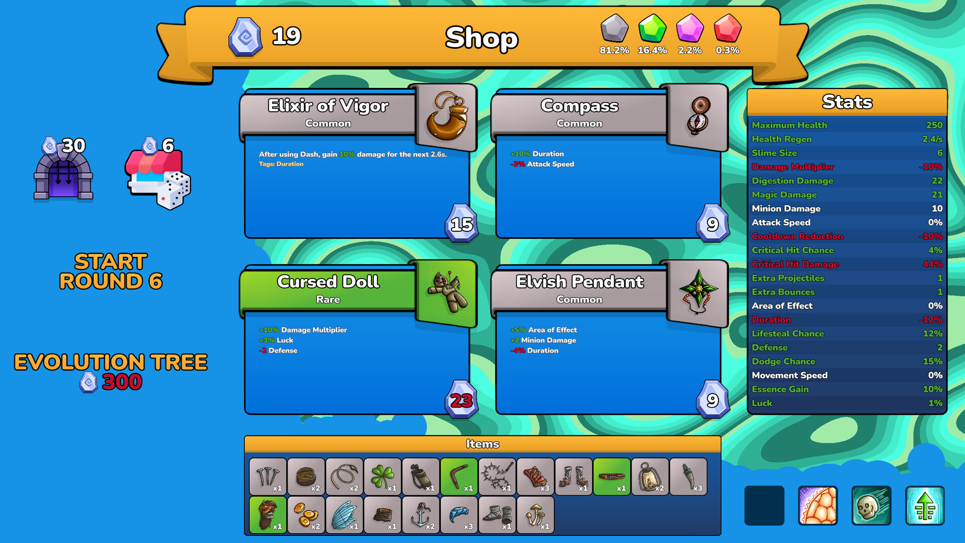 Collect the essence of enemies to spend in the shop for slime evolutions and items of different rarities.