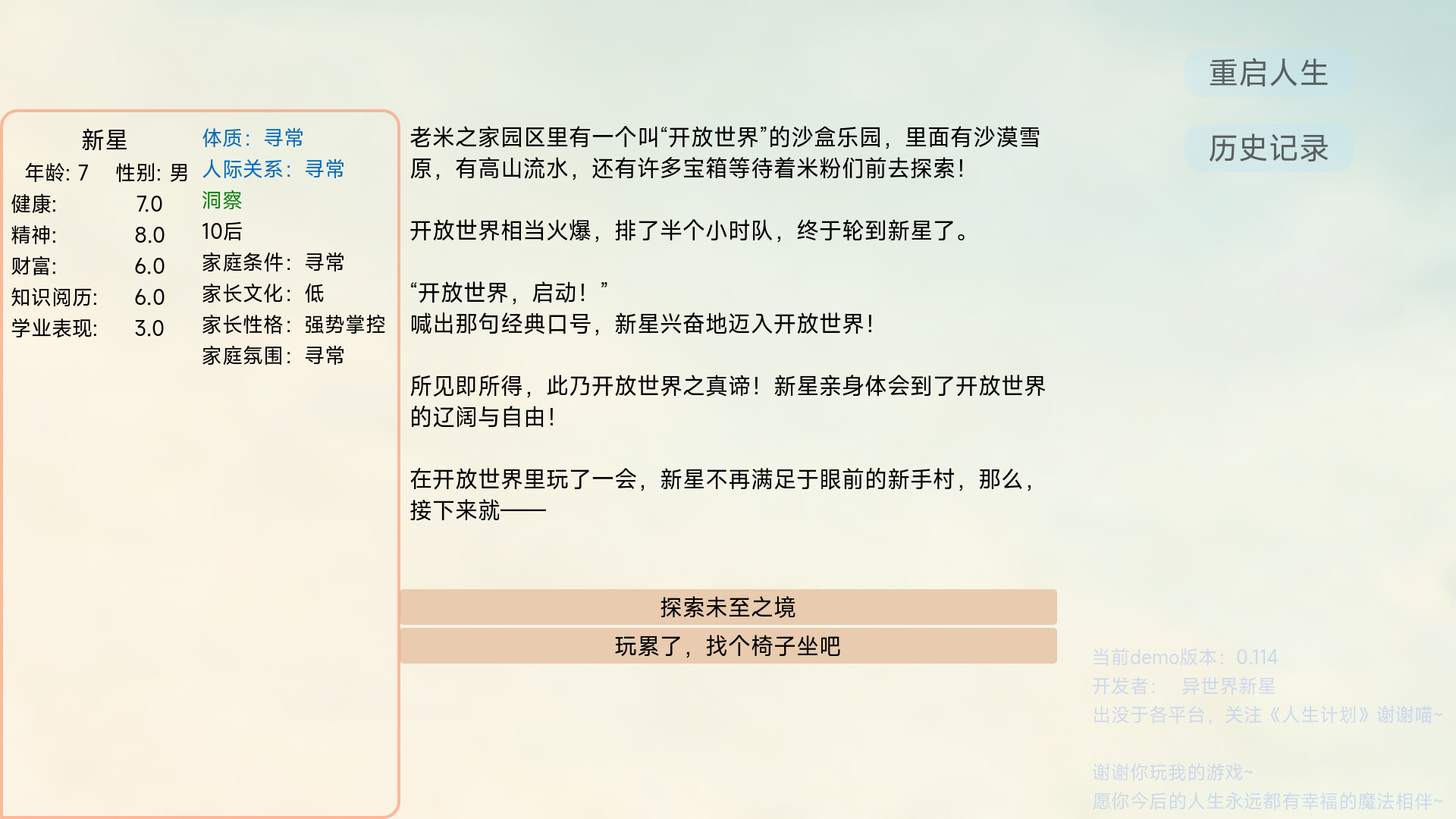这里是《人生计划 Project Life》的公开试玩版,当前Demo版本:0.114。在本 Demo 中,你可以体验到:《人生计划 Project Life》的主推故事集《中国式人生》,其中0-15岁的大部分内容!Demo文本量十万三,单局15-20分钟(一万多字)。当前版本随机事件池的内容量足够低重复率游玩十余次!欢迎下载尝鲜!Demo和本体的故事集都会持续更新!欢迎关注!----《人生计划 Project Life》,一款剧情丰富的roguelike互动小说游戏,也是一款拥有无限可能的构史引擎!