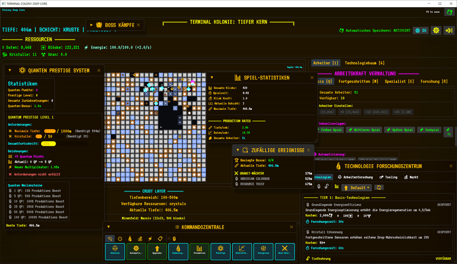 自动化系统:部署量子挖掘机、无人机群(效率提升5倍)及AI核心增益(每核心+10%)等先进设备实现自主资源生成