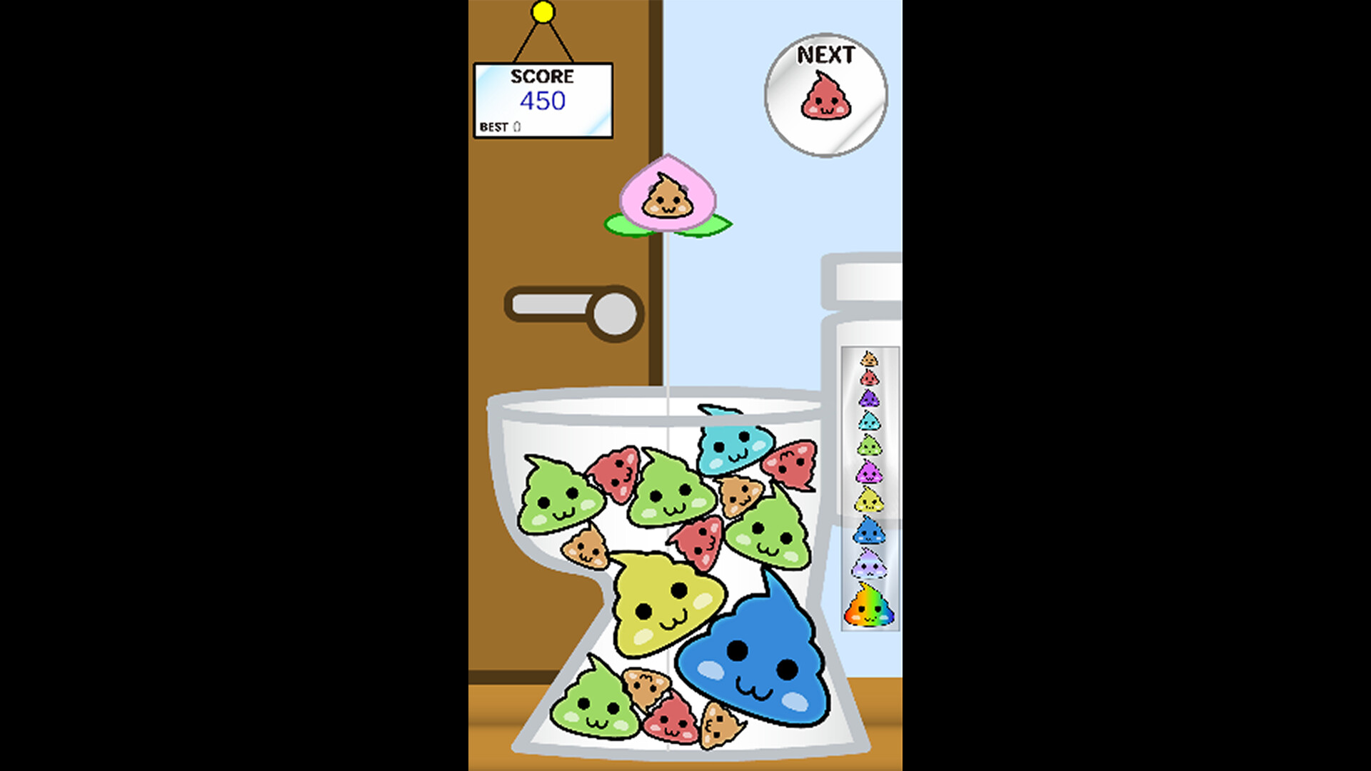 Drop poop into the toilet and merge matching colors to create bigger ones!