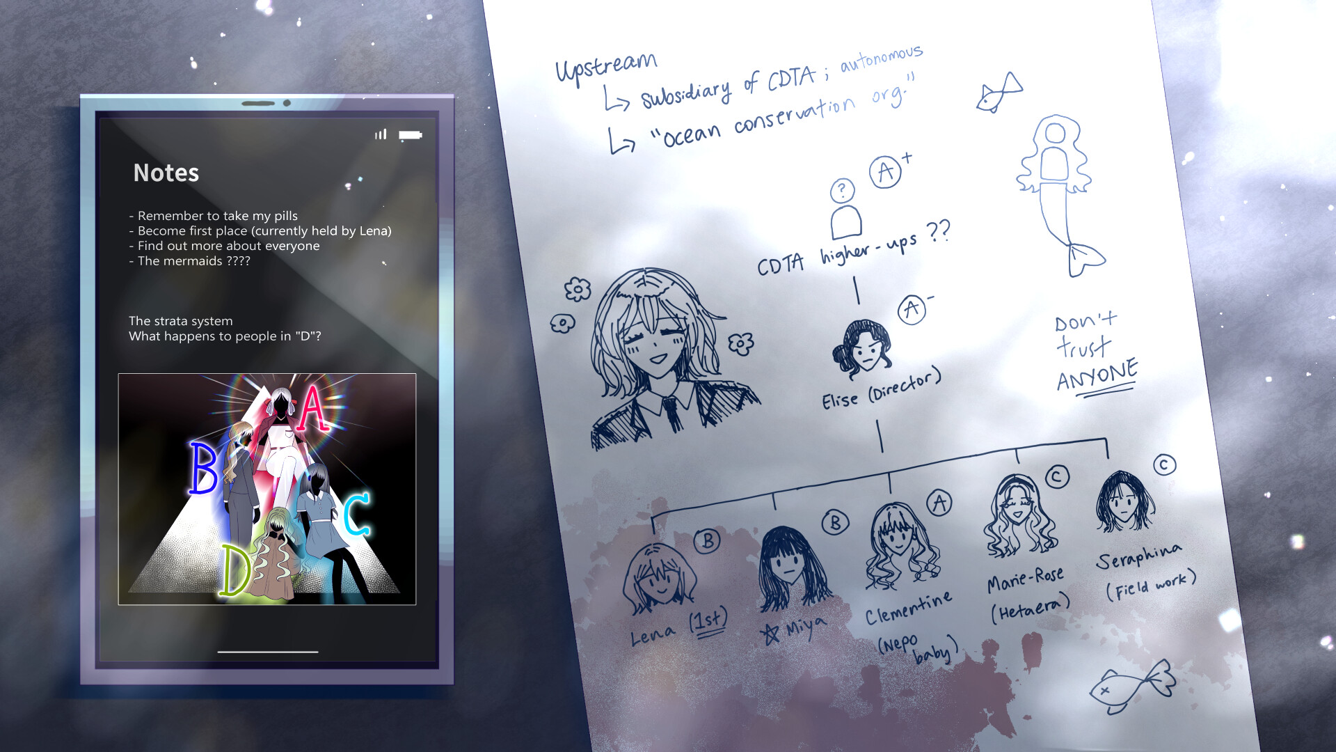 Lena, the current No.1 Mermaid Hunter, is your nemesis. People say she's ruthless and arrogant, but she's taken an interest in you and helps you multiple times... maybe because she already suspects something. Your co-workers are eyeing the same mermaids as you are. Will you sabotage or collude with them?