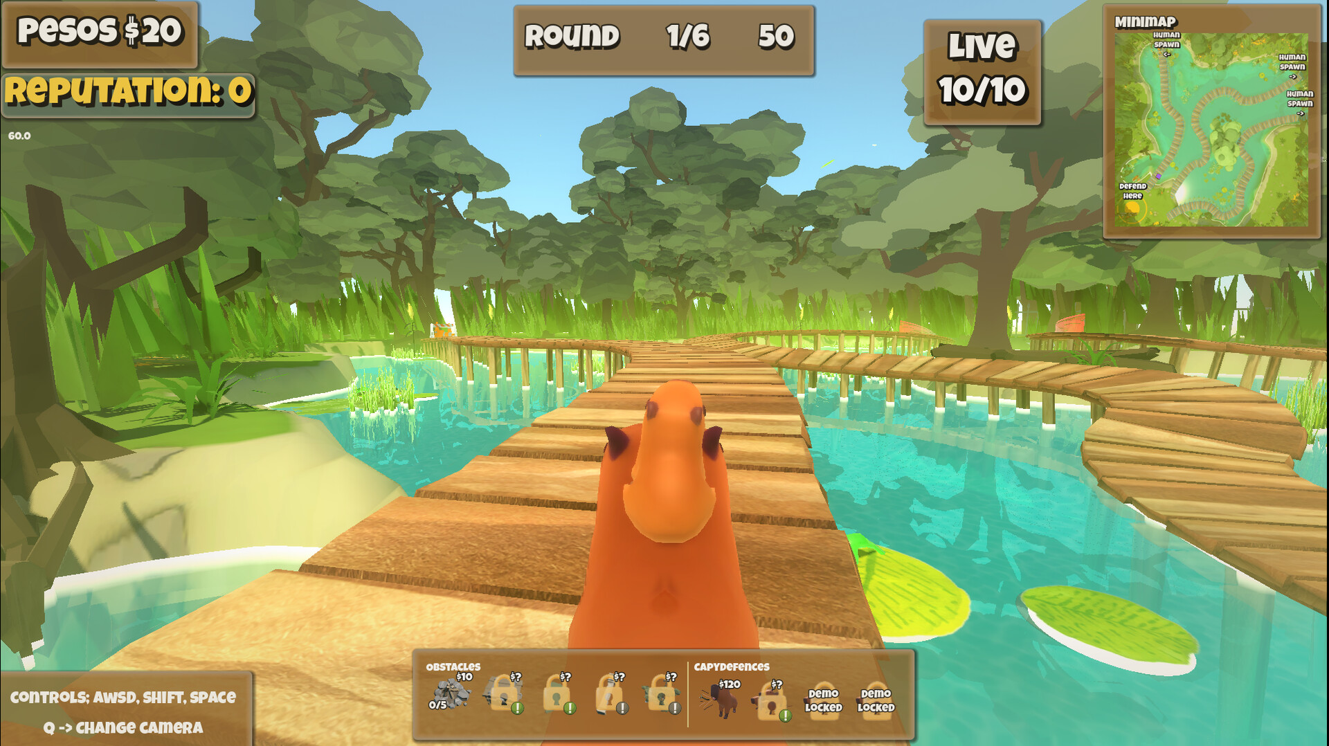Protect your family against waves of human invaders in this physics-based tower defence game. Play with a 3rd person capybara pushing or throwing frogs at those silly humans to make them fall into the water! Get money and place obstacles or build towers to defend your wetland!