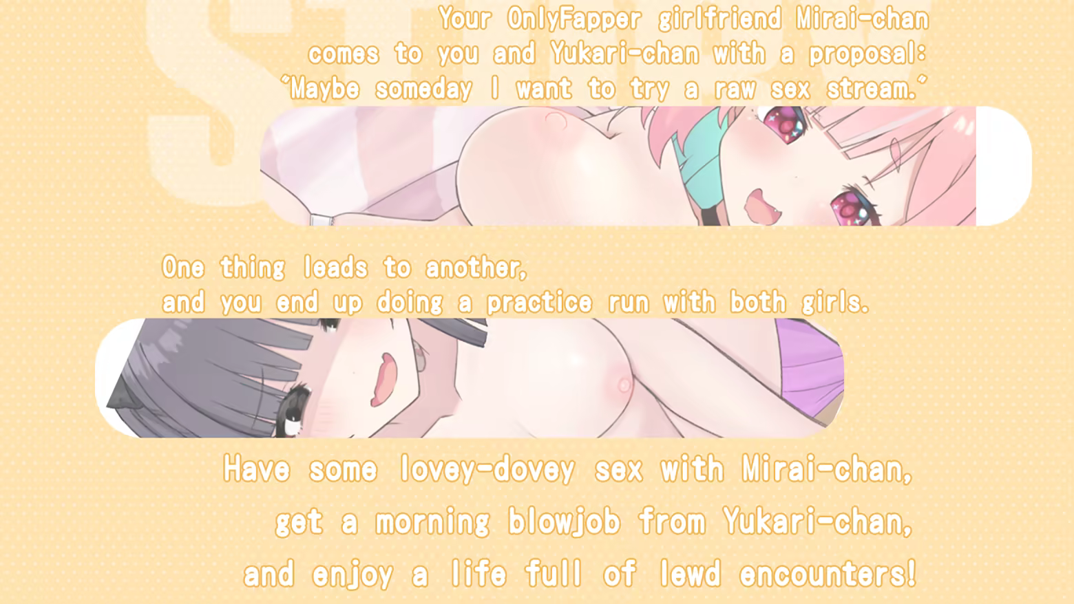 Your steamy life together with your favorite OnlyFappers continues! You still get along great with Mirai-chan, and Yukari-chan never stops teasing you with her naughty pranks.