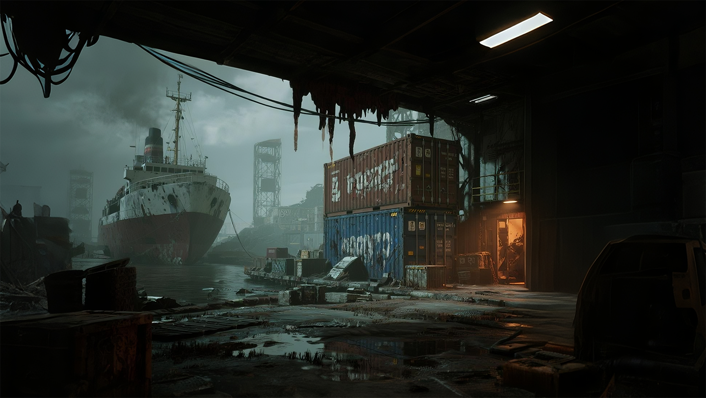 Something unexpected happened. Stacked containers, faintly visible docks in the mist, I must disembark. Perhaps there are tools and medicine inside the container. We will face challenges such as disasters, zombies, pirates, and survival pressures until the small boat is built and we return to land.