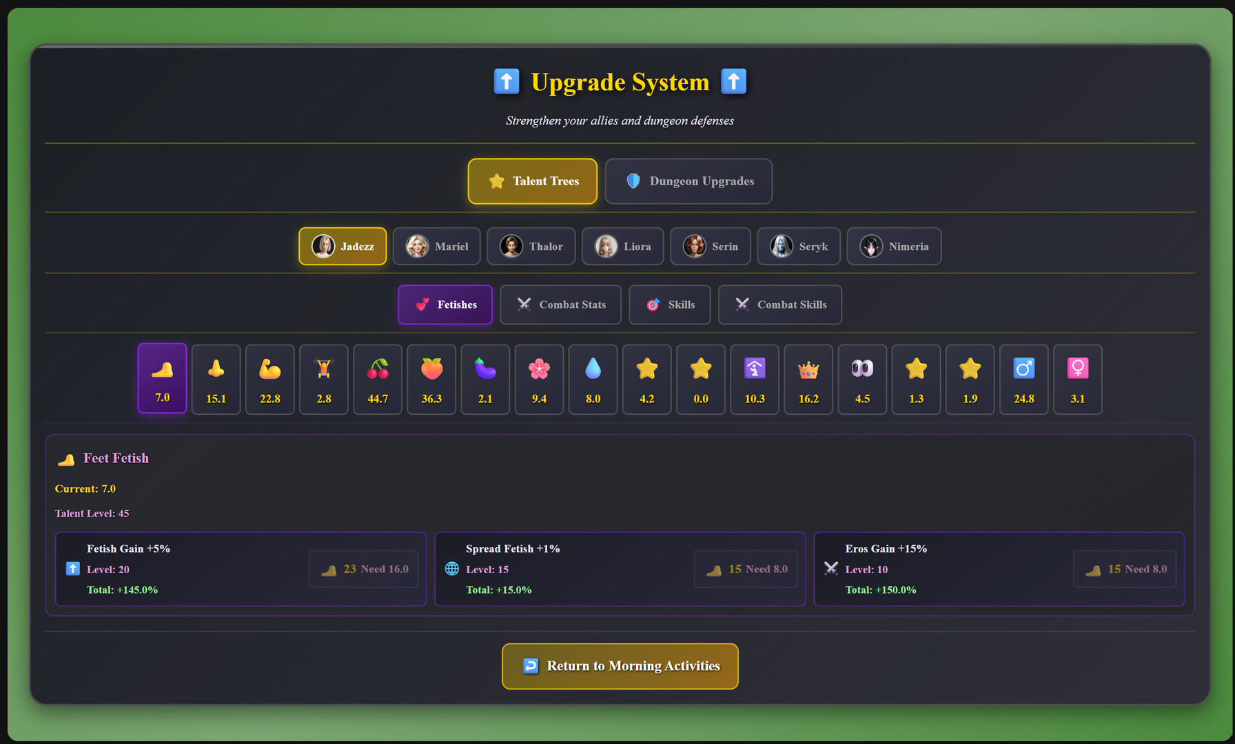 It includes optional sexual content and fetish material such as feet, body fluids, NTR (Netorare), same-sex relationships (gay and lesbian), transformation, gender-bending, femboy, and futanari themes. Nearly all adult content is avoidable through player choices.