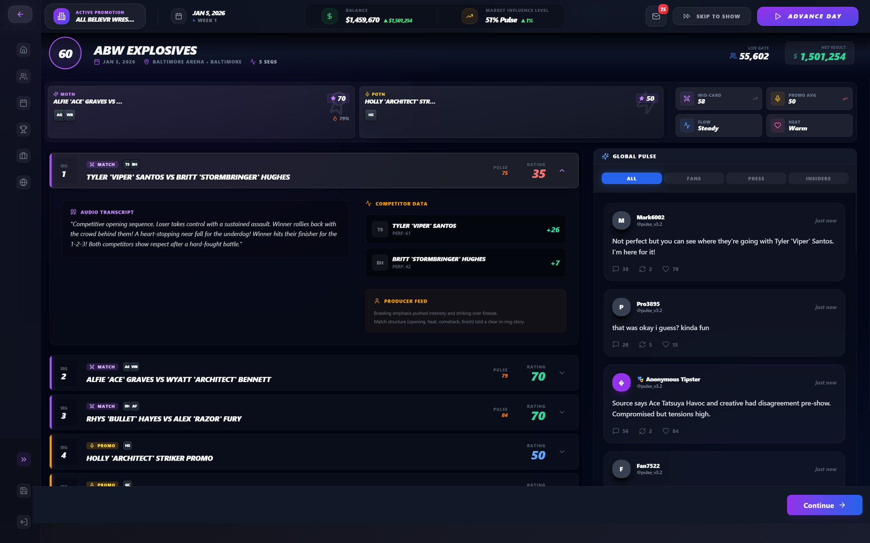• Custom promo flow system to shape promos, confrontations, and angles instead of relying on canned results