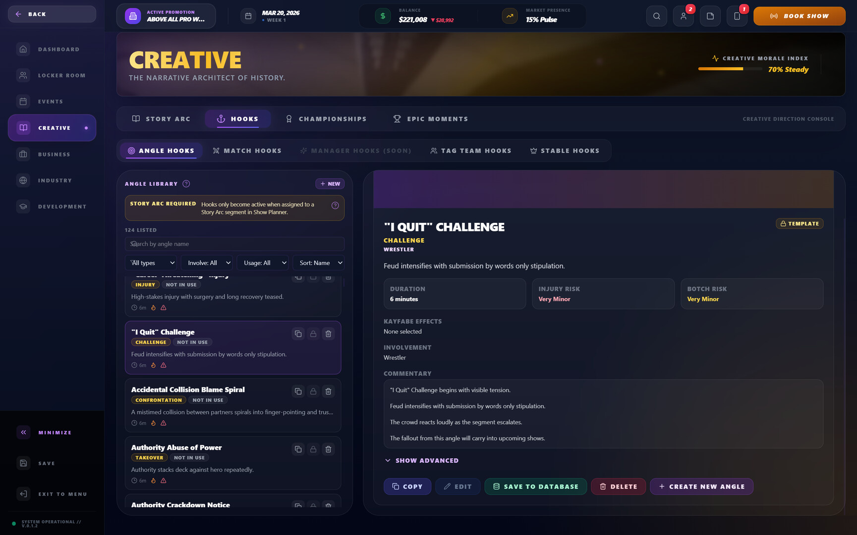 • Deploy Angle Hooks (betrayals, debuts, attacks) from a library or create your own