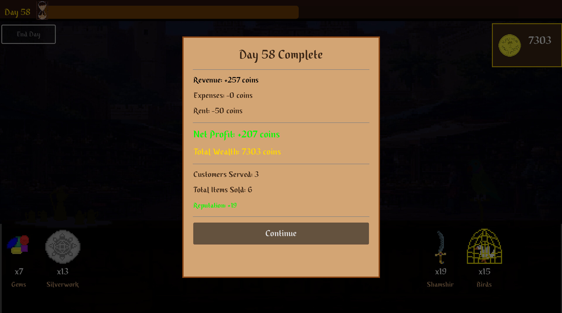 Start at the outer districts, resupply your stock, and start the day to start haggling and selling goods. Review the summary, pay attention to hints the customers give about upcoming good prices, and start the day again. Watch the patience timer above customer heads, increase your reputation and coins with sales.