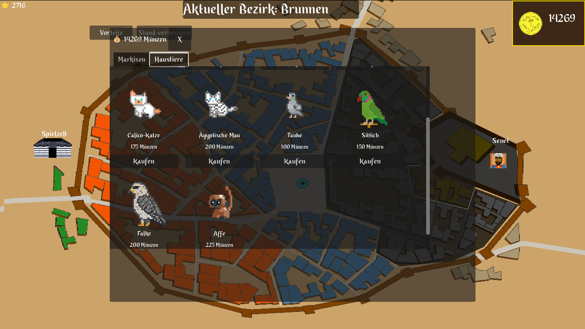 Schalte nach und nach neue Bezirke mit teureren Waren frei, dekoriere deinen Stand oder besuche das Spielzelt.