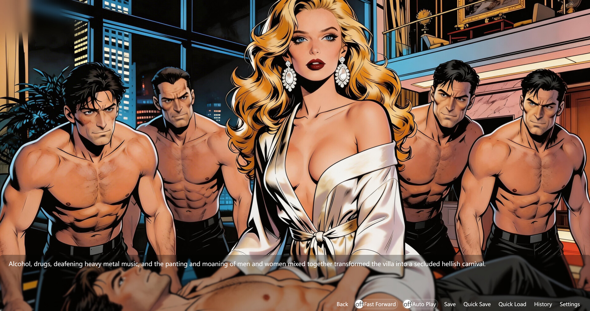 This (visual interactive fiction) game describes the use of supernatural science fiction items, leading to non-consensual behavior, BDSM, and even supernatural dangerous behaviors beyond human limits, and describes organized crime and violence.