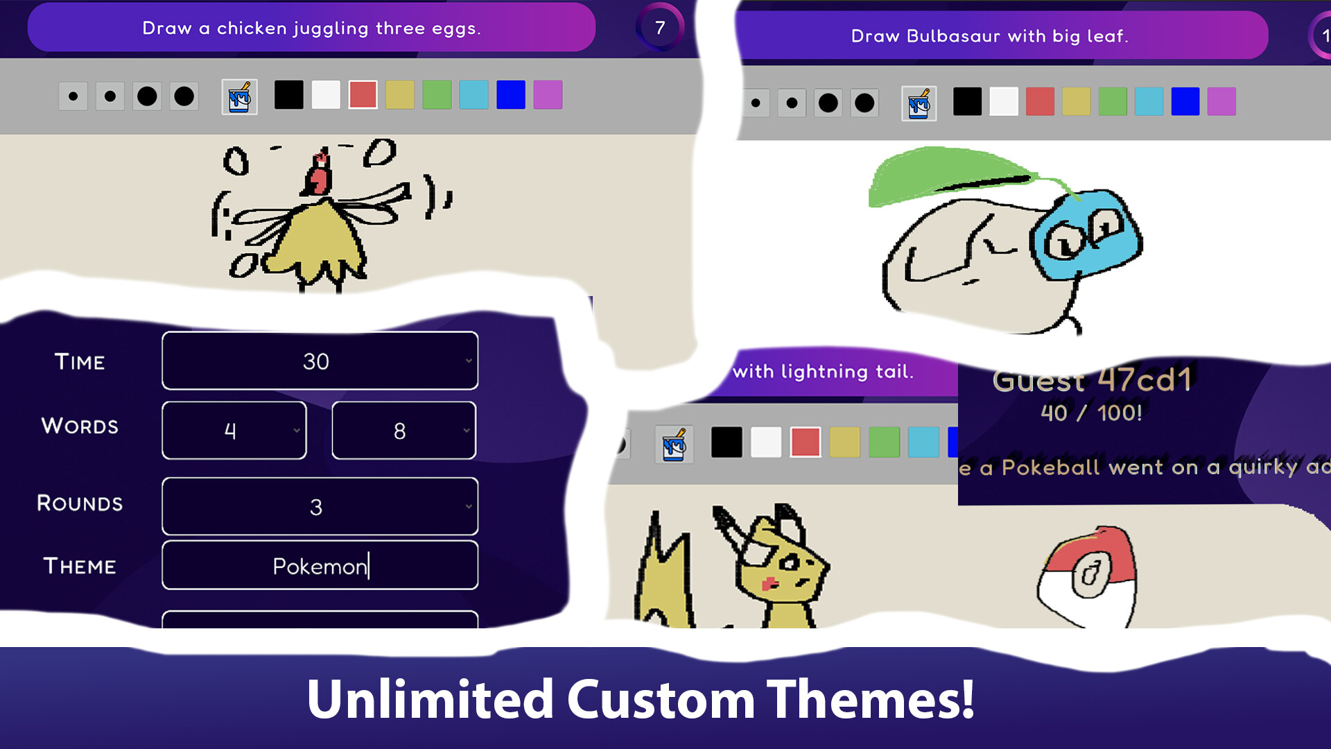 Draw your best (or worst) interpretation before time runs out! Start a room, invite your friends (or total strangers), and get ready for a round of ridiculous AI-generated prompts — or create your own with unlimited custom topic!