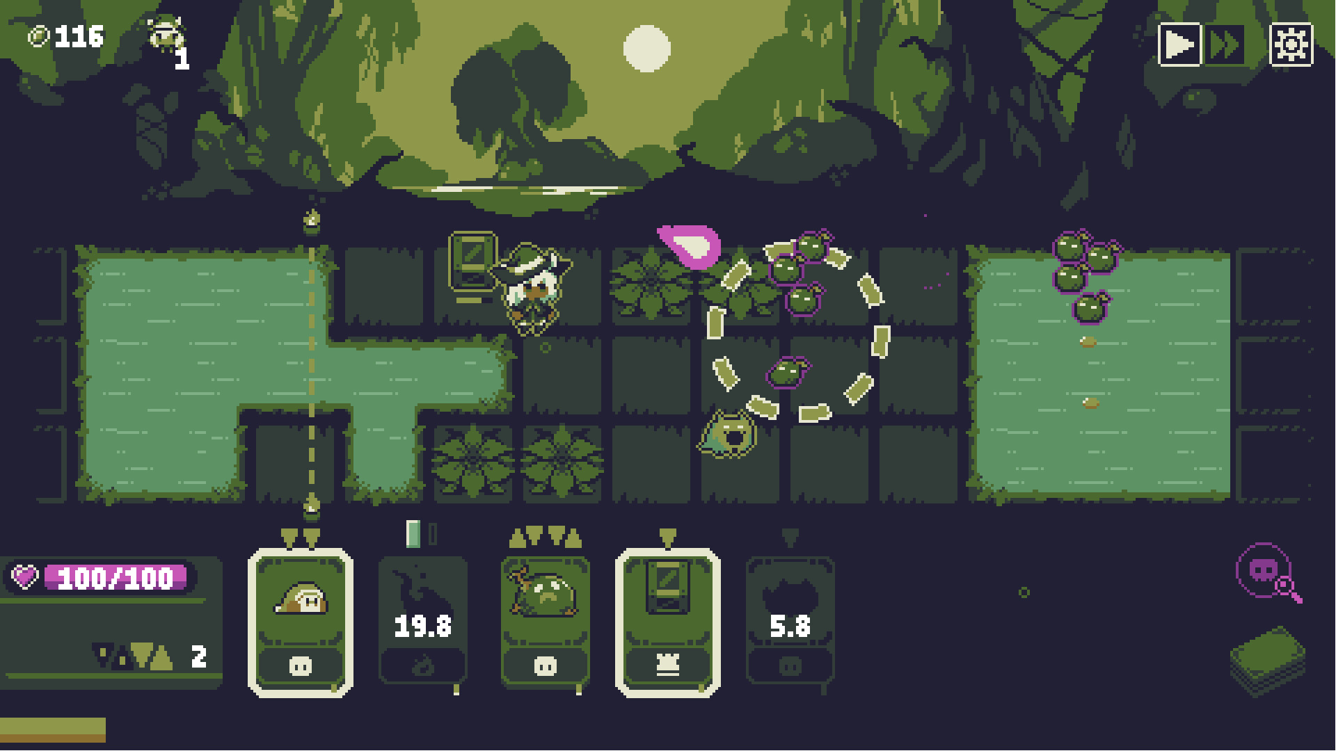 "Nightcap Witch" is a rogue-lite strategy game where you battle using a limited set of units. Build a deck of 8 cards and defend the spring from the onslaught of nightmare legions. Can you drive away the nightmares and reclaim your peaceful sleep?