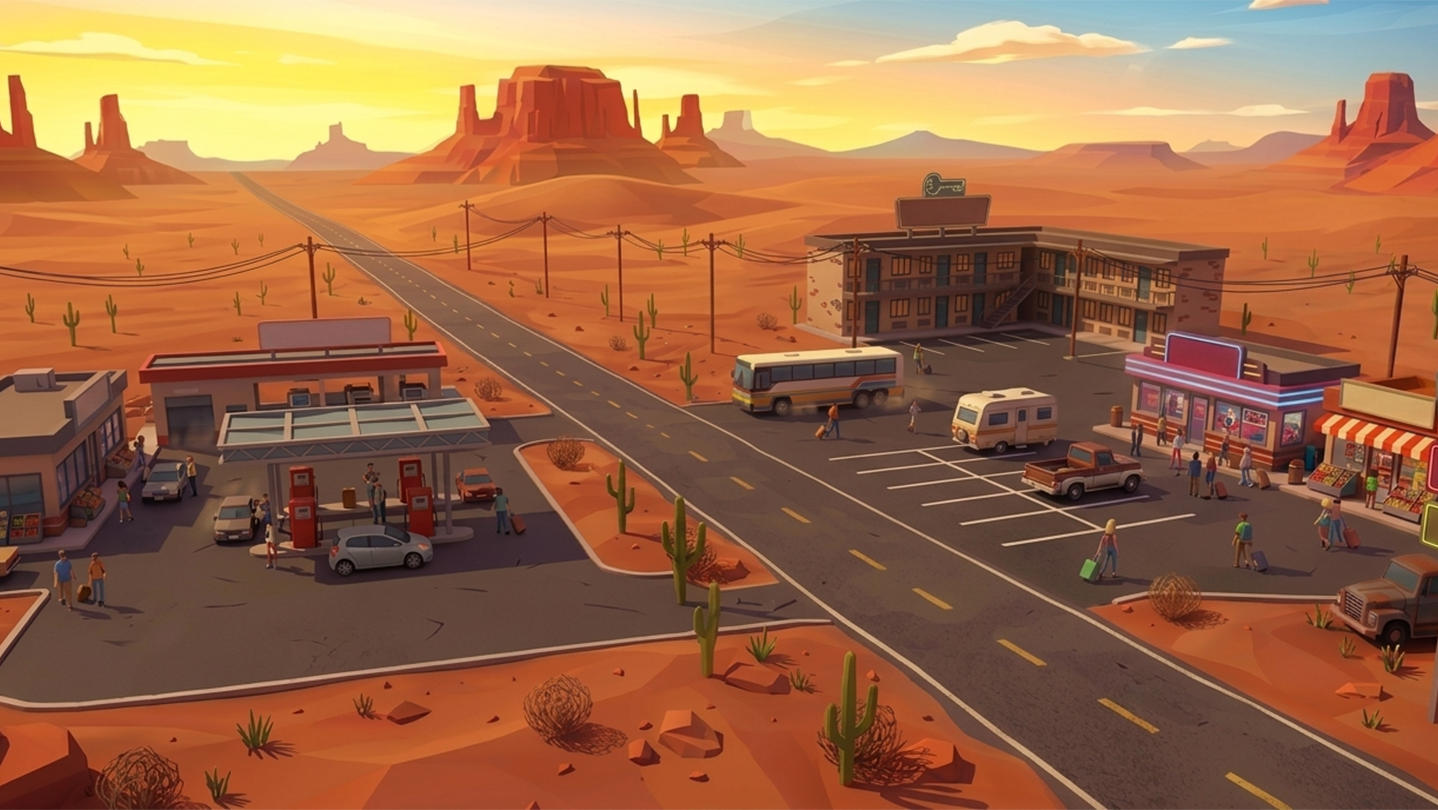 Start med et lite stoppested og bygg det ut til et stort anlegg. Fyll hyller, selg drivstoff, driv restaurant og motell, og hold alt rent. Med god styring blir det et populært stopp!
