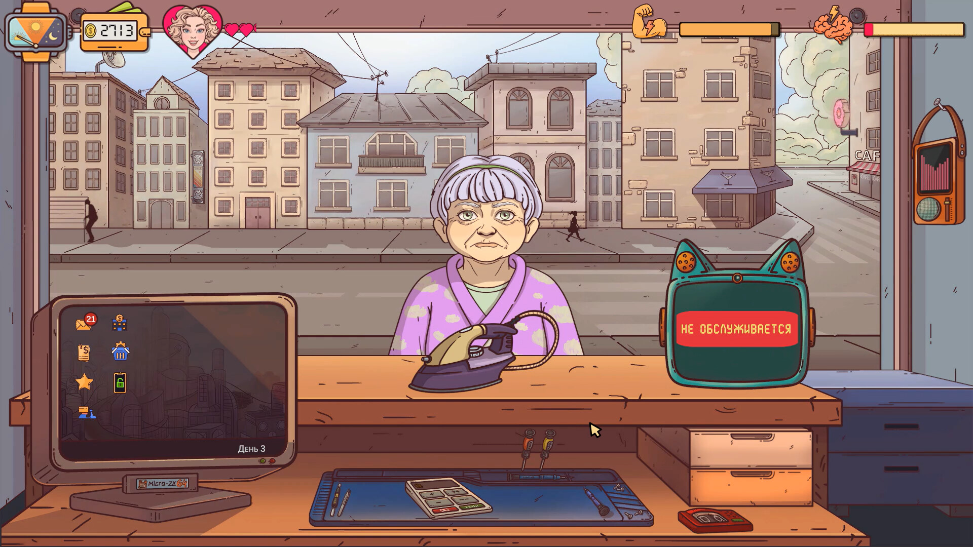 Погрузитесь в работу уютной мастерской в большом городе под расслабляющую атмосферную музыку, взаимодействуйте с личными данными клиентов, управляйте энергией и стрессом и принимайте решения, которые определят развитие истории.