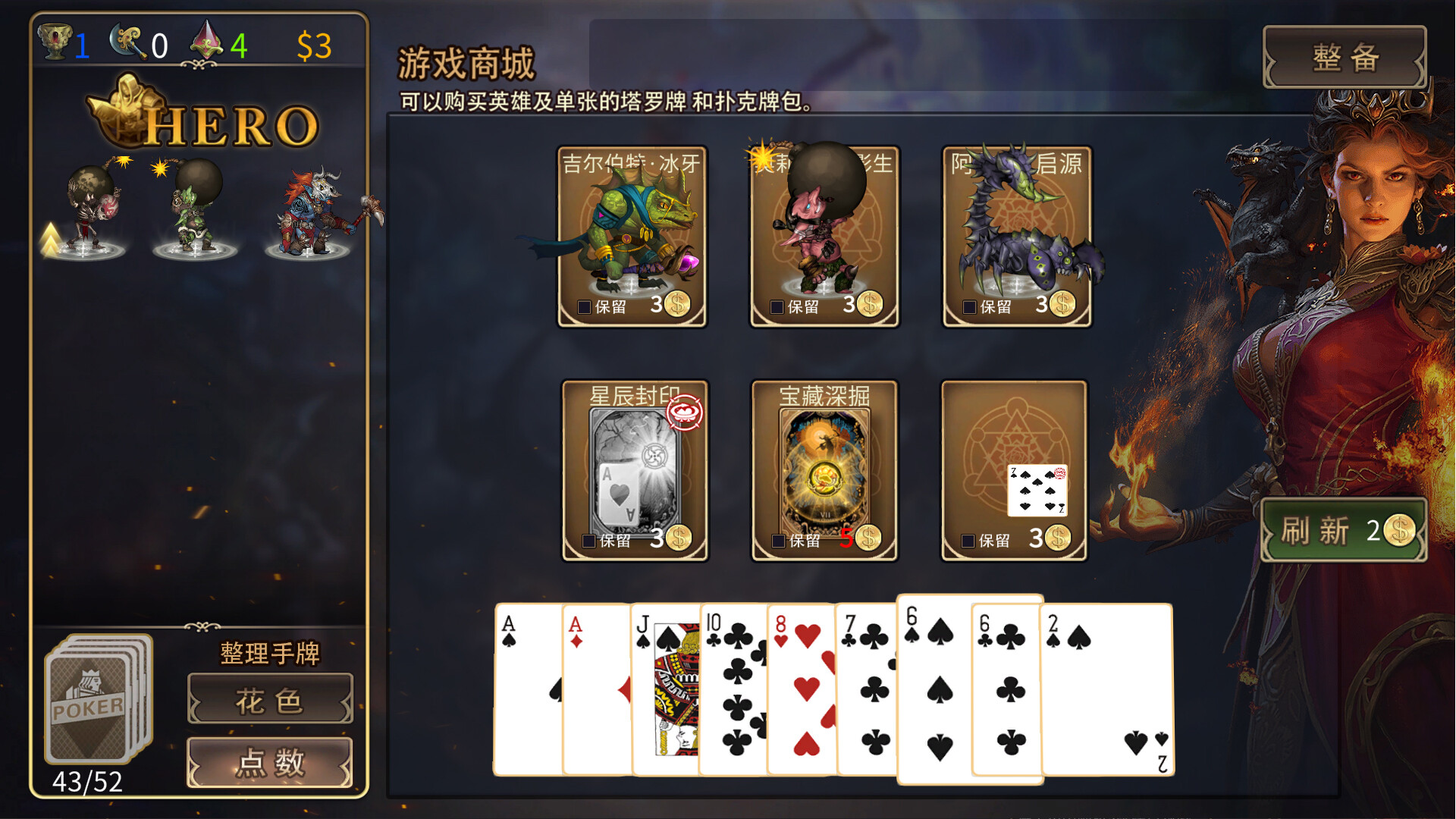 • 养成与准备:从商店获取英雄、塔罗牌与遗物,调整小队阵容,构建牌局框架。融合牌型组合与塔罗遗物效果,预设你的战斗节奏。