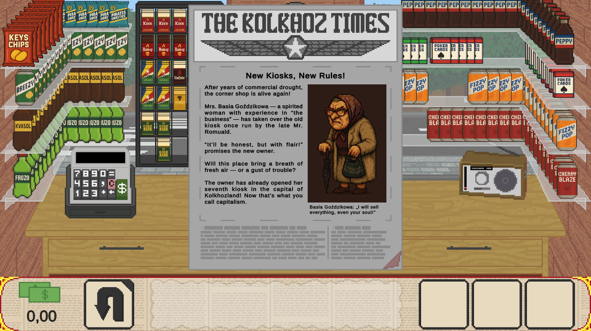 Run a tiny 90s kiosk in a chaotic Eastern country - Kolkhozland. Serve quirky customers, survive inspections, pick a side in a local power struggle, and uncover a hidden conspiracy - all in a story-driven retro management sim full of humor and choices.