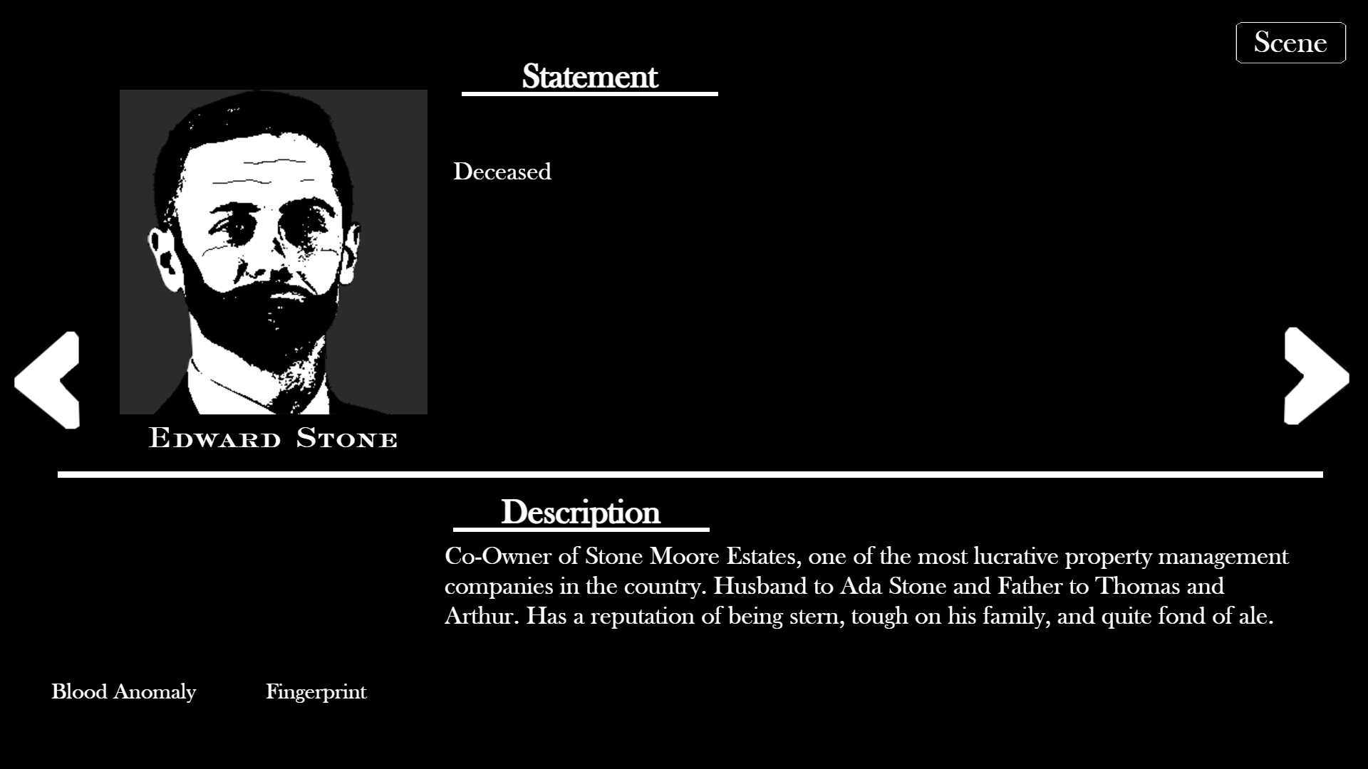 The game contains mild horror elements, stylized crime scenes, and non-graphic depictions of violence within a historical mystery setting. Scenes involving injuries or death are presented in a restrained, investigative context. The game includes no sexual content, no nudity, and no real-world drug use. Any substances referenced are fictional and used solely for world-building.