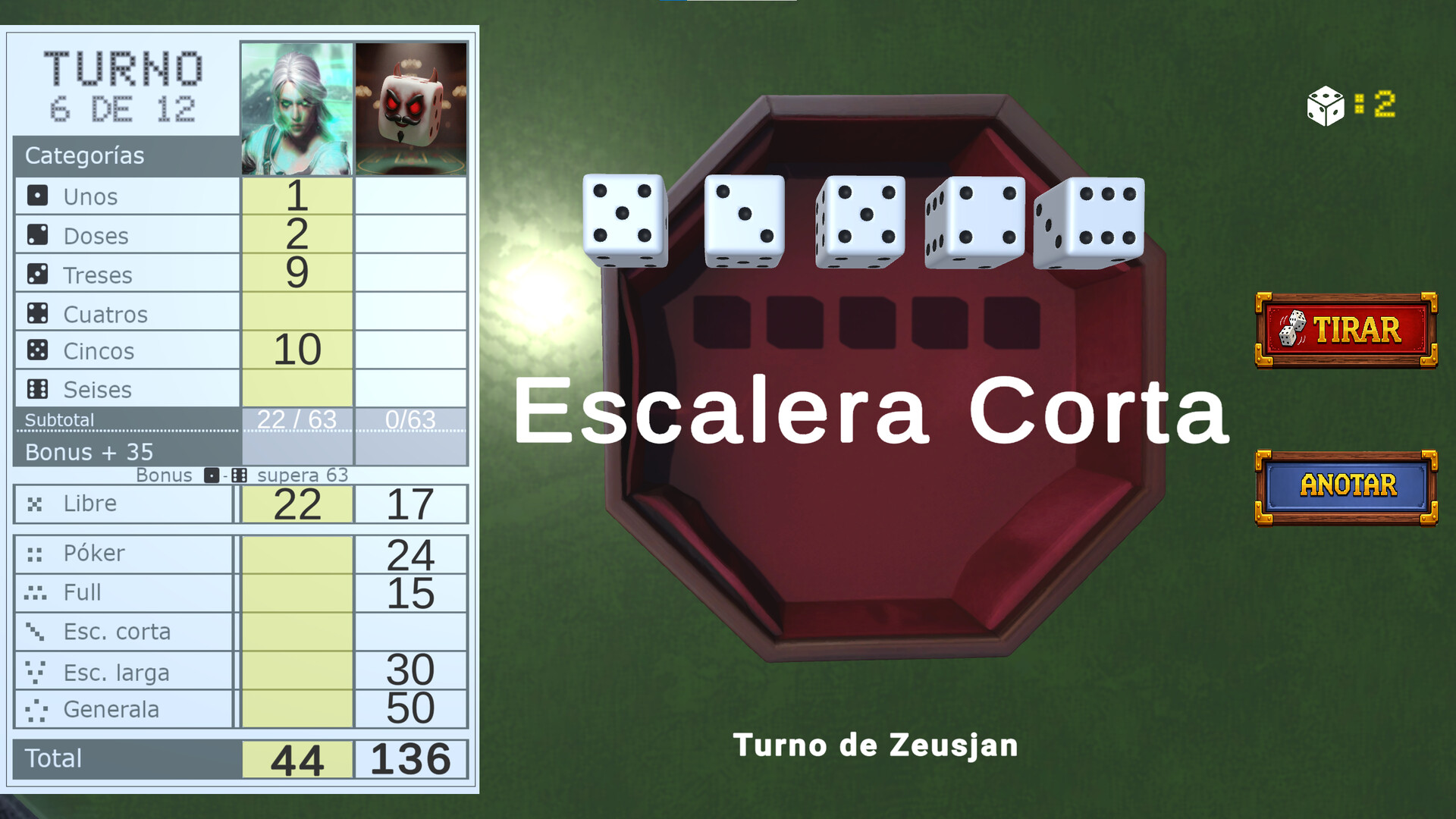 • Interfaz Clara: Ayudas visuales para saber qué dados seleccionar, cuántos puntos obtendrías en cada categoría y cuántos turnos quedan.