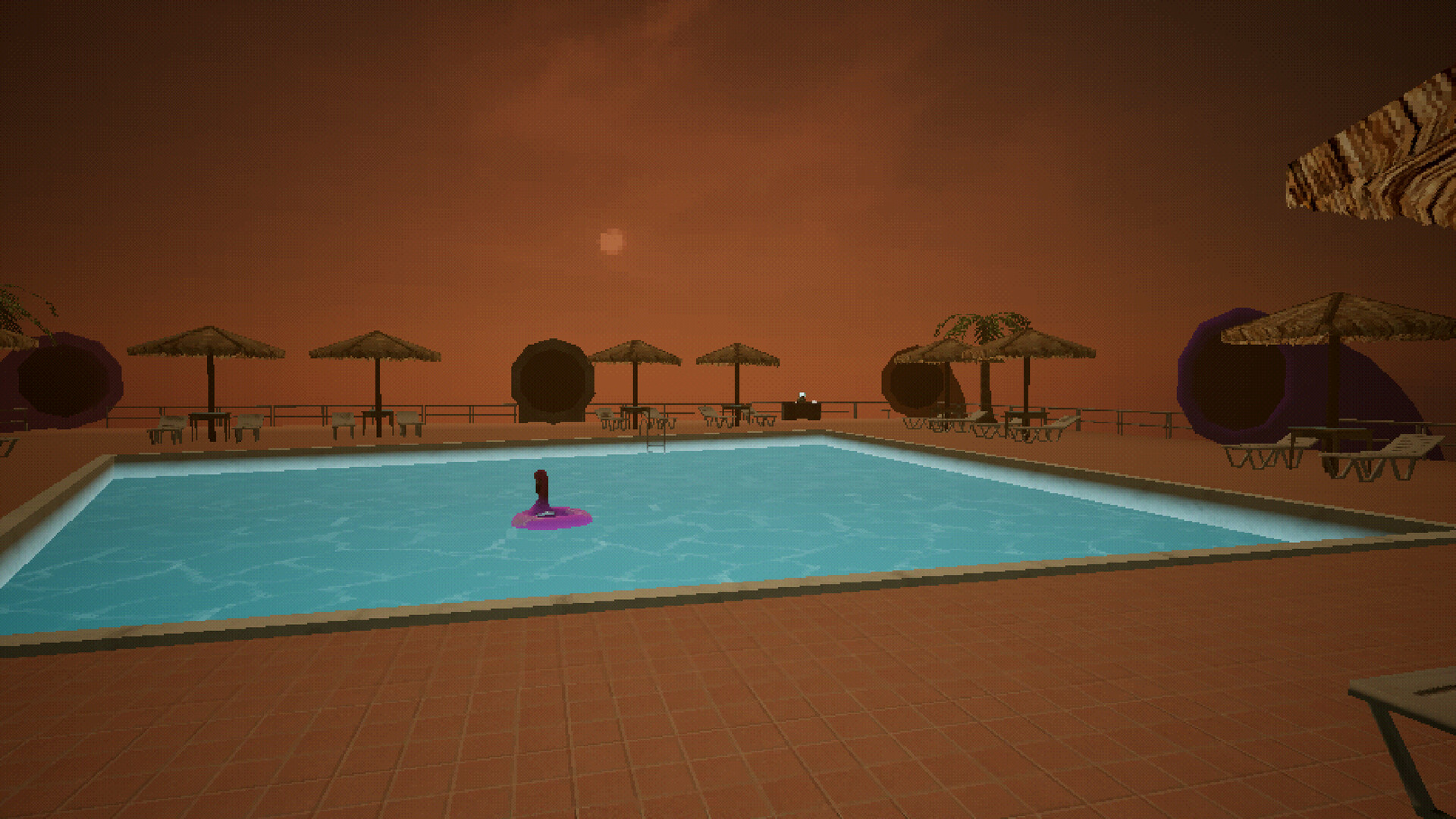 • Level 3: Dreampools - The most euphoric environment in Poolscape. Bright colored pools, matte-colored tiles, and low-poly palm trees give players the feeling of wandering through a dream. Surely nothing is watching you… right?