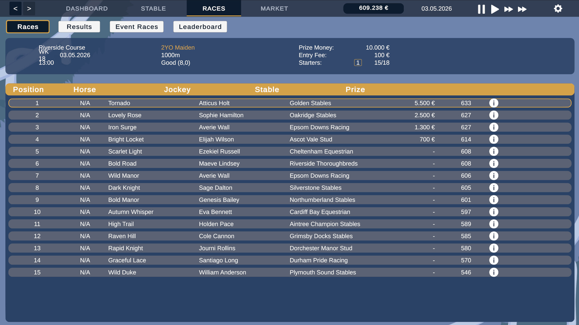 📈 Long-term Progression – Staff develops over years, horses rise in rating