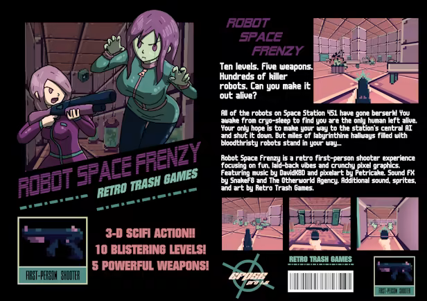 All the robots on Space Station 451 have gone berserk! Only one human is left alive! Can she survive the onslaught and escape? Blast your way through homicidal robots in this groovy throwback retro FPS!