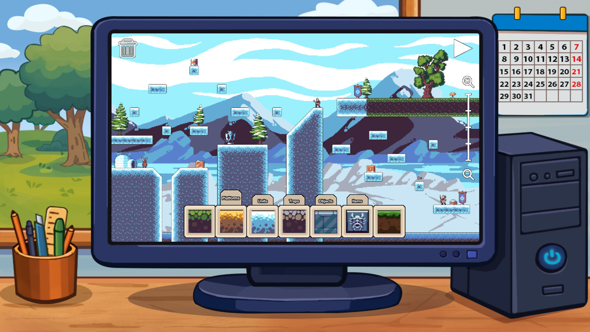 - Create games by dragging and dropping objects into the level editor
