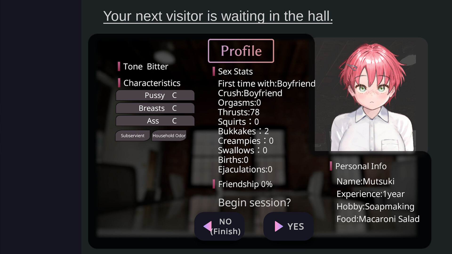 Touch-starved... Virgin... Shy... Pathological liar... Lonely... Slut... Futanari... Masochist...