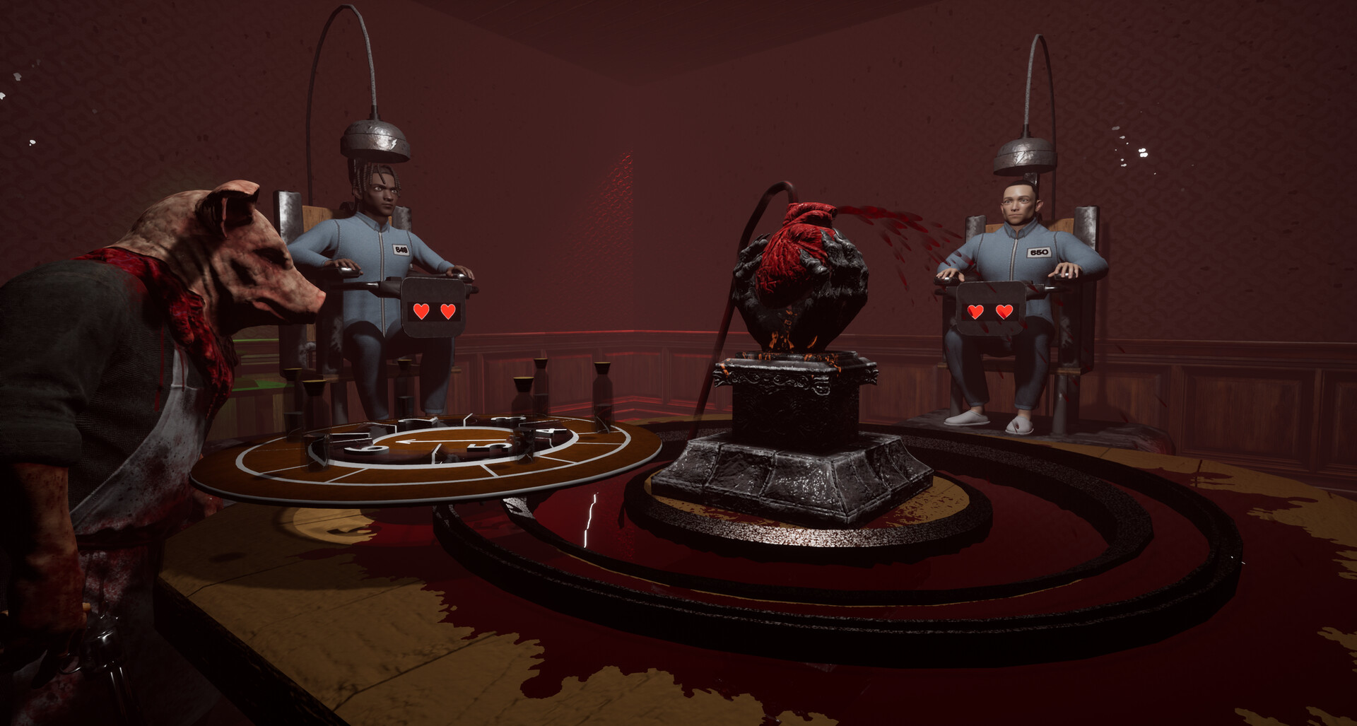 The Pigman worships the outcome, whispering in static and flickering light as the round unfolds.