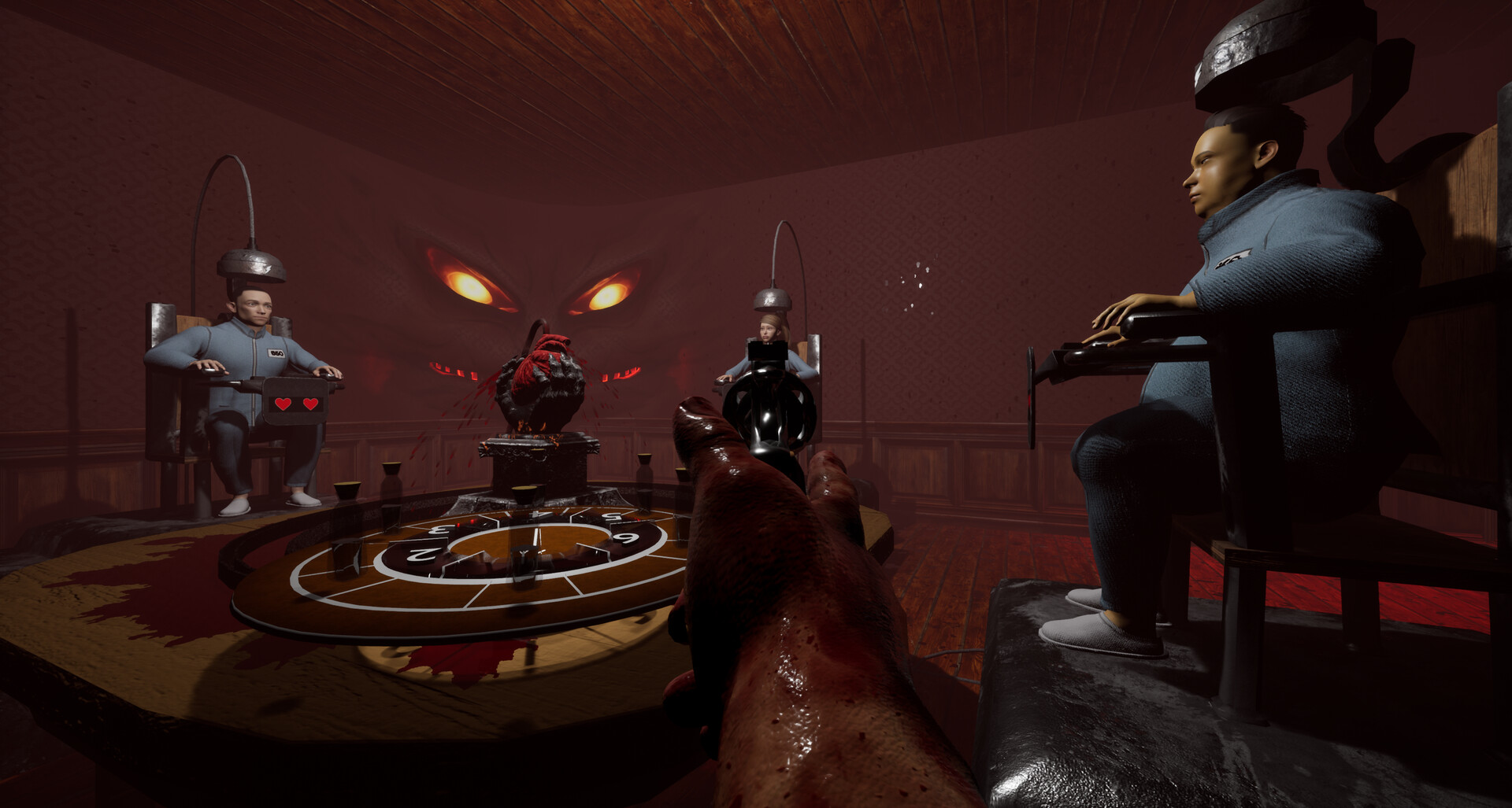 The Pigman worships the outcome, whispering in static and flickering light as the round unfolds.