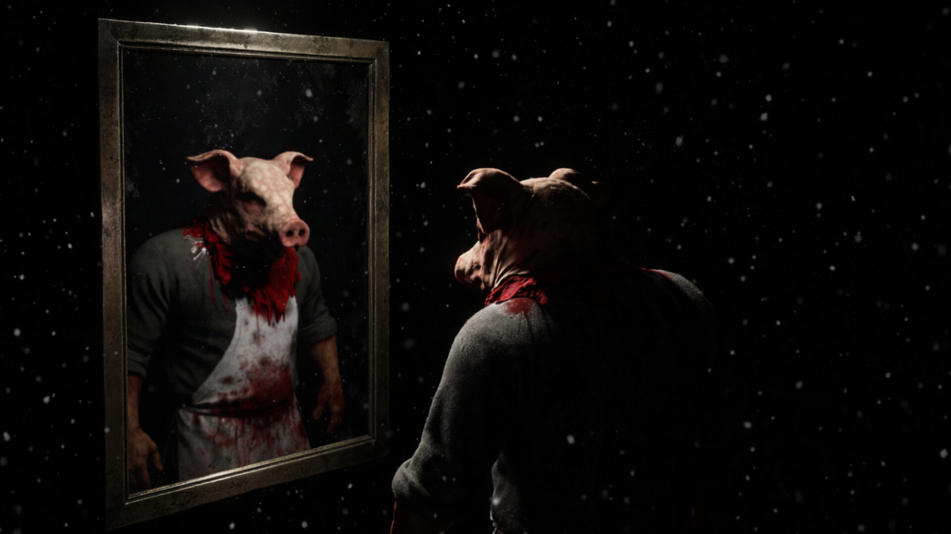 The Pigman worships the outcome, whispering in static and flickering light as the round unfolds.