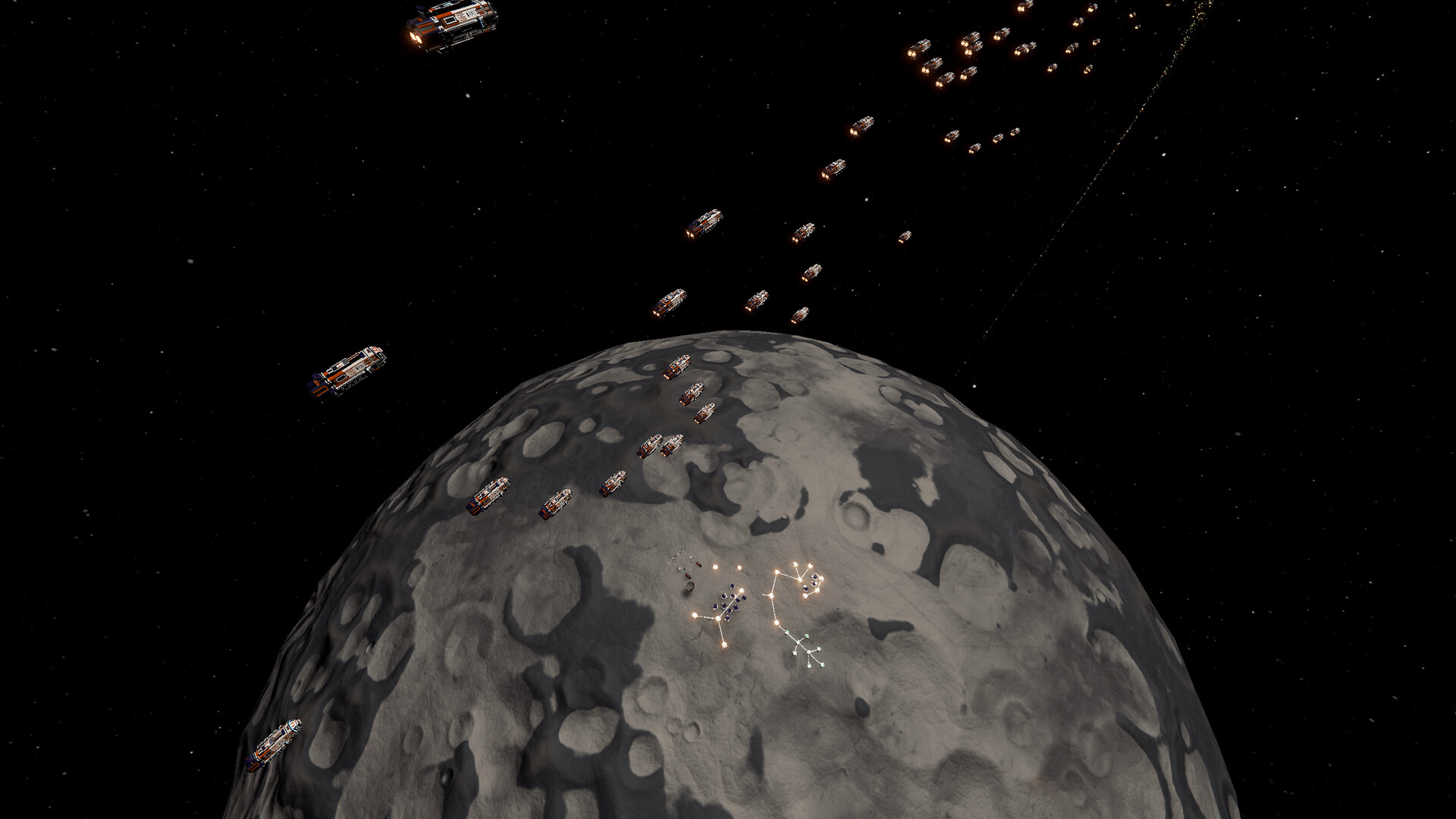 Use flagships to lead your convoys across the system, not worrying about each-and-every ship. This game's been built for optimisation and consistency, so even at very high time warp (up to 100,000x) your fleet and their physics operate reliably and with high performance.