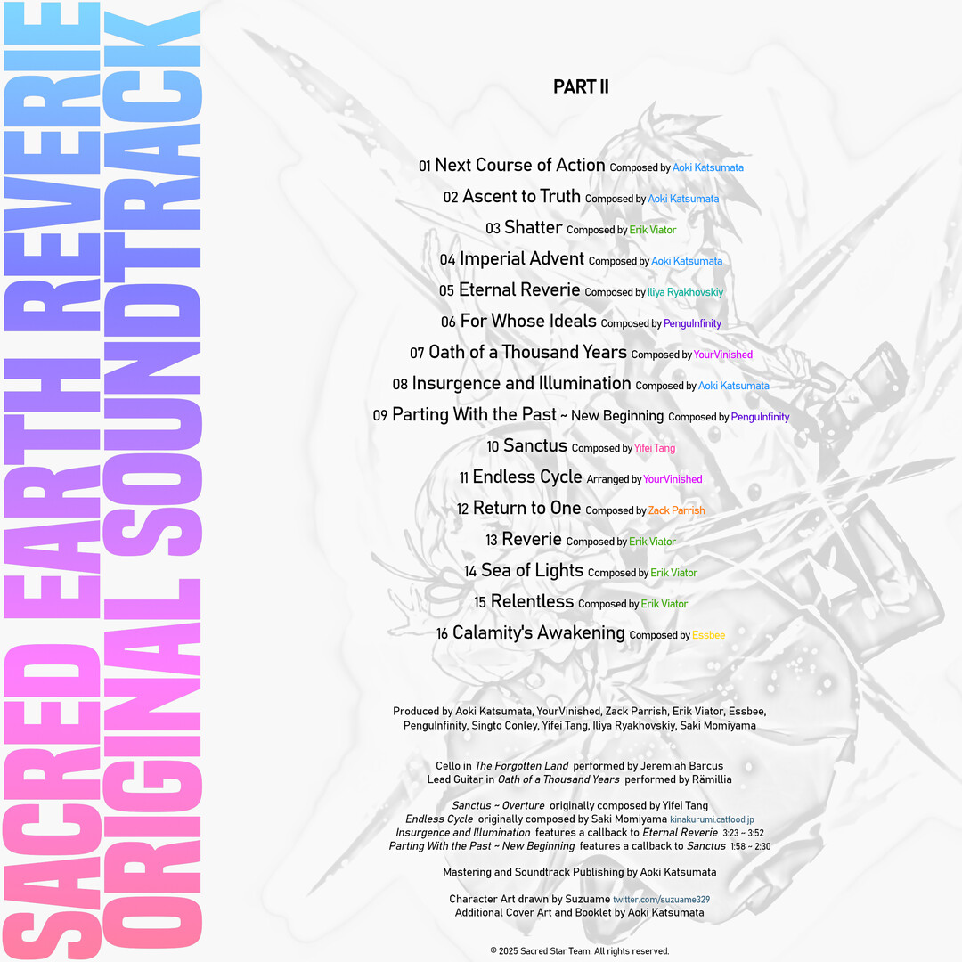 The Sacred Earth - Reverie Original Soundtrack features 36 tracks of music from the game, along with a few bonuses. Influenced by 2000s era JRPGs, a veritable all star gathering of composers, including Eclipse Sound Team, Zack Parrish, Essbee, and more come together to bring you this inspired soundtrack.