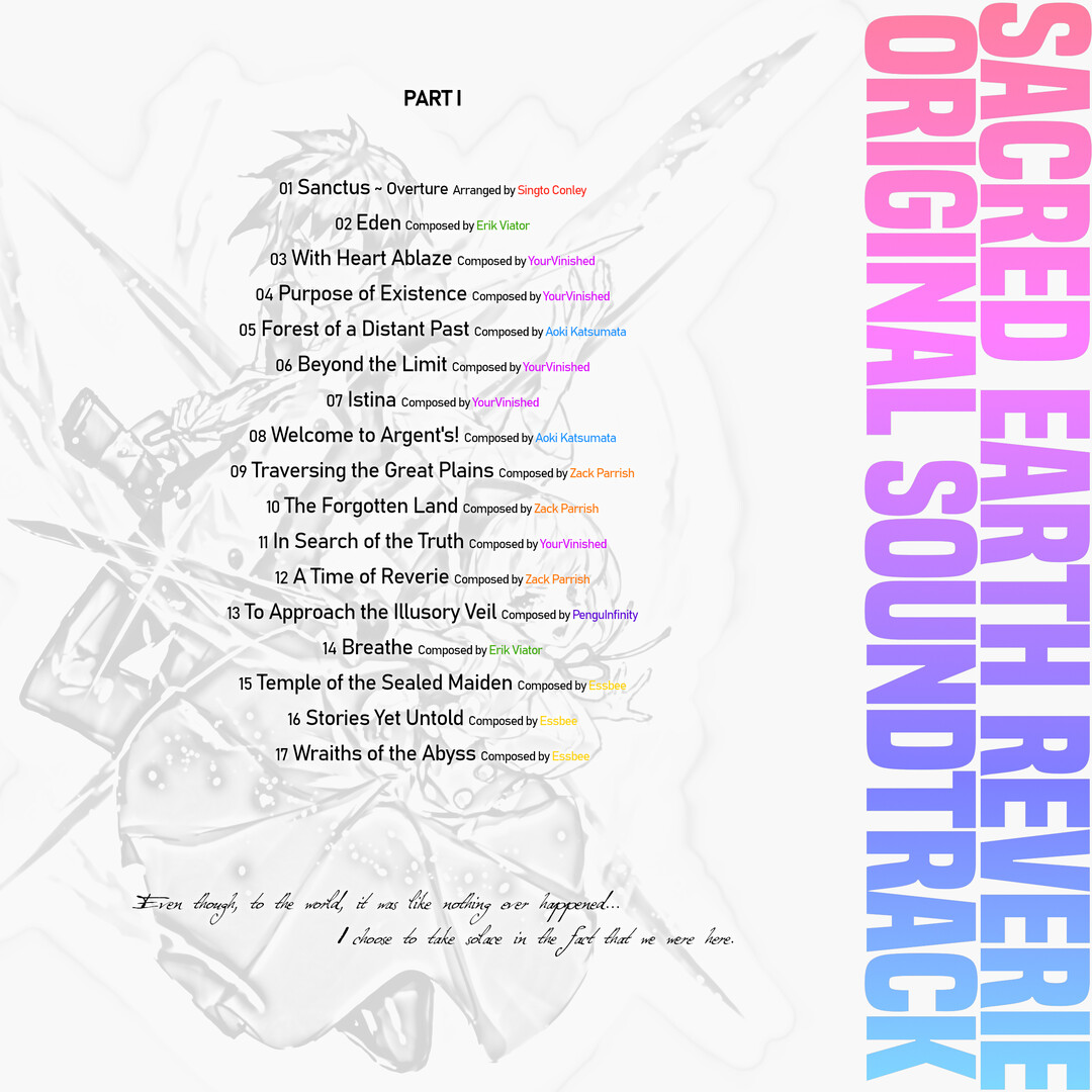 The Sacred Earth - Reverie Original Soundtrack features 36 tracks of music from the game, along with a few bonuses. Influenced by 2000s era JRPGs, a veritable all star gathering of composers, including Eclipse Sound Team, Zack Parrish, Essbee, and more come together to bring you this inspired soundtrack.