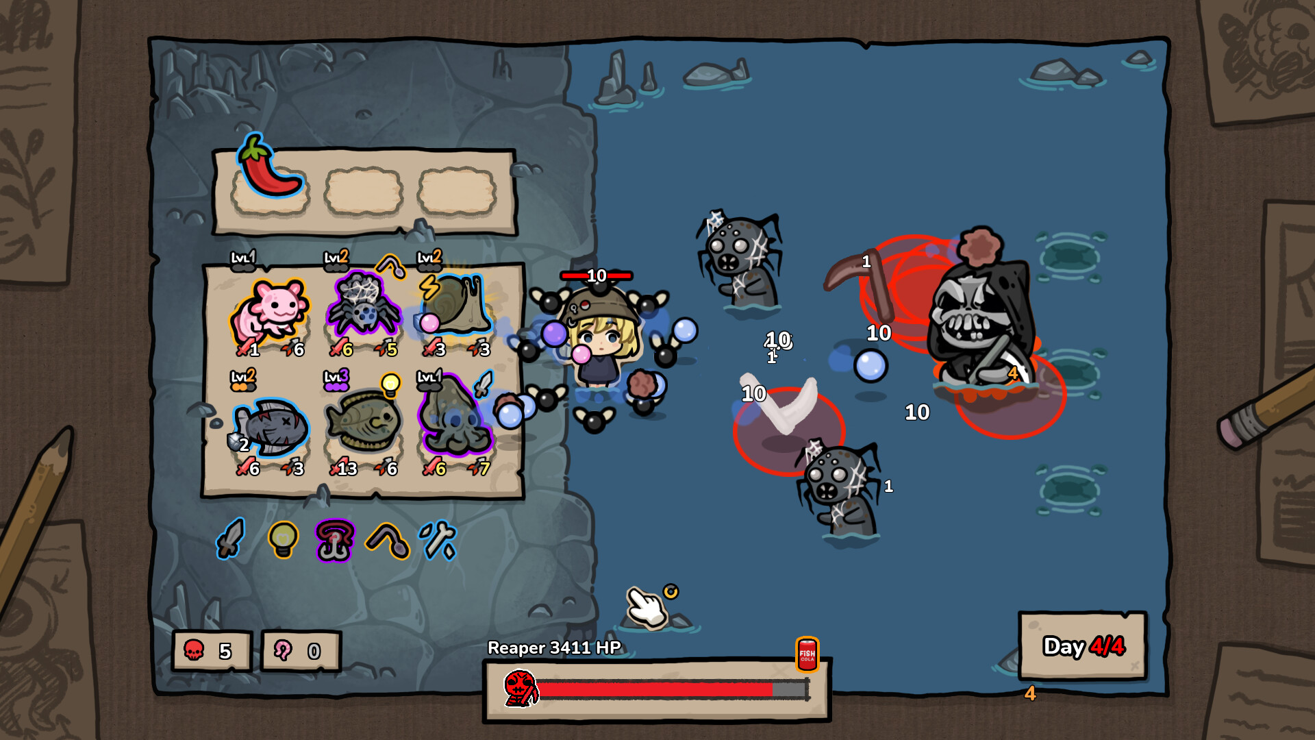 Autobattler Tower Defense Rogue-like about fishing! Reel in creatures with unique abilities and create an overpowered build to fight off waves of undead!