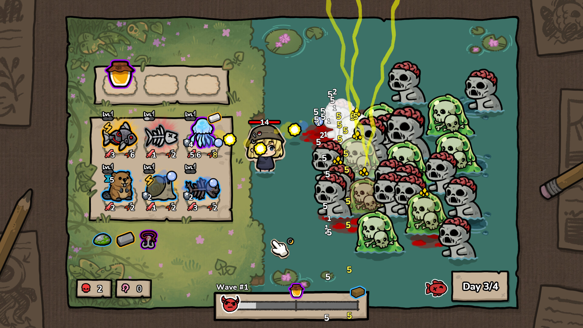 Autobattler Tower Defense Rogue-like about fishing! Reel in creatures with unique abilities and create an overpowered build to fight off waves of undead!