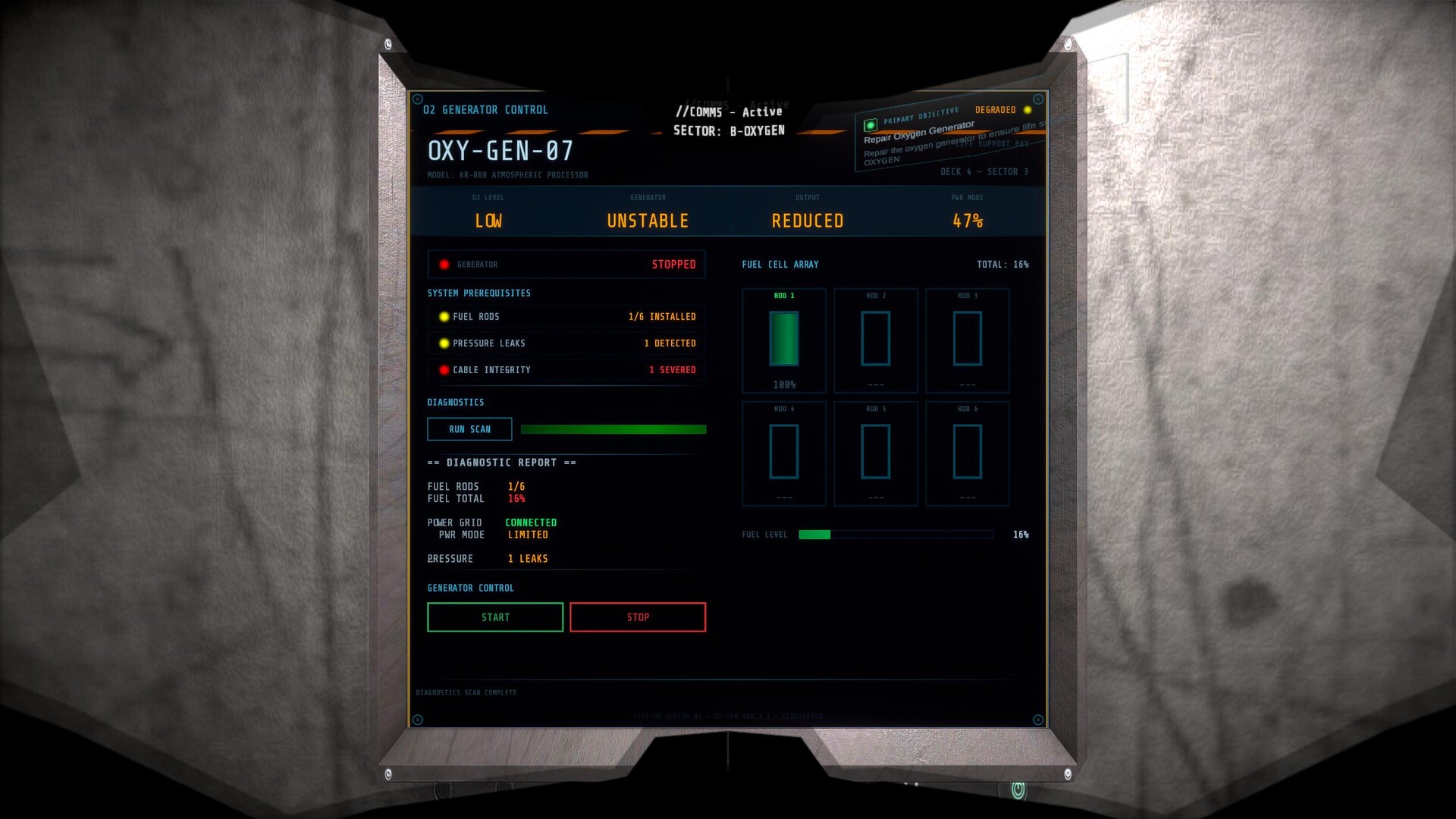 Five sectors share limited power — lighting, oxygen, fog suppression, security, and servers. Reroute at breaker terminals, but every sector you starve makes something else worse.