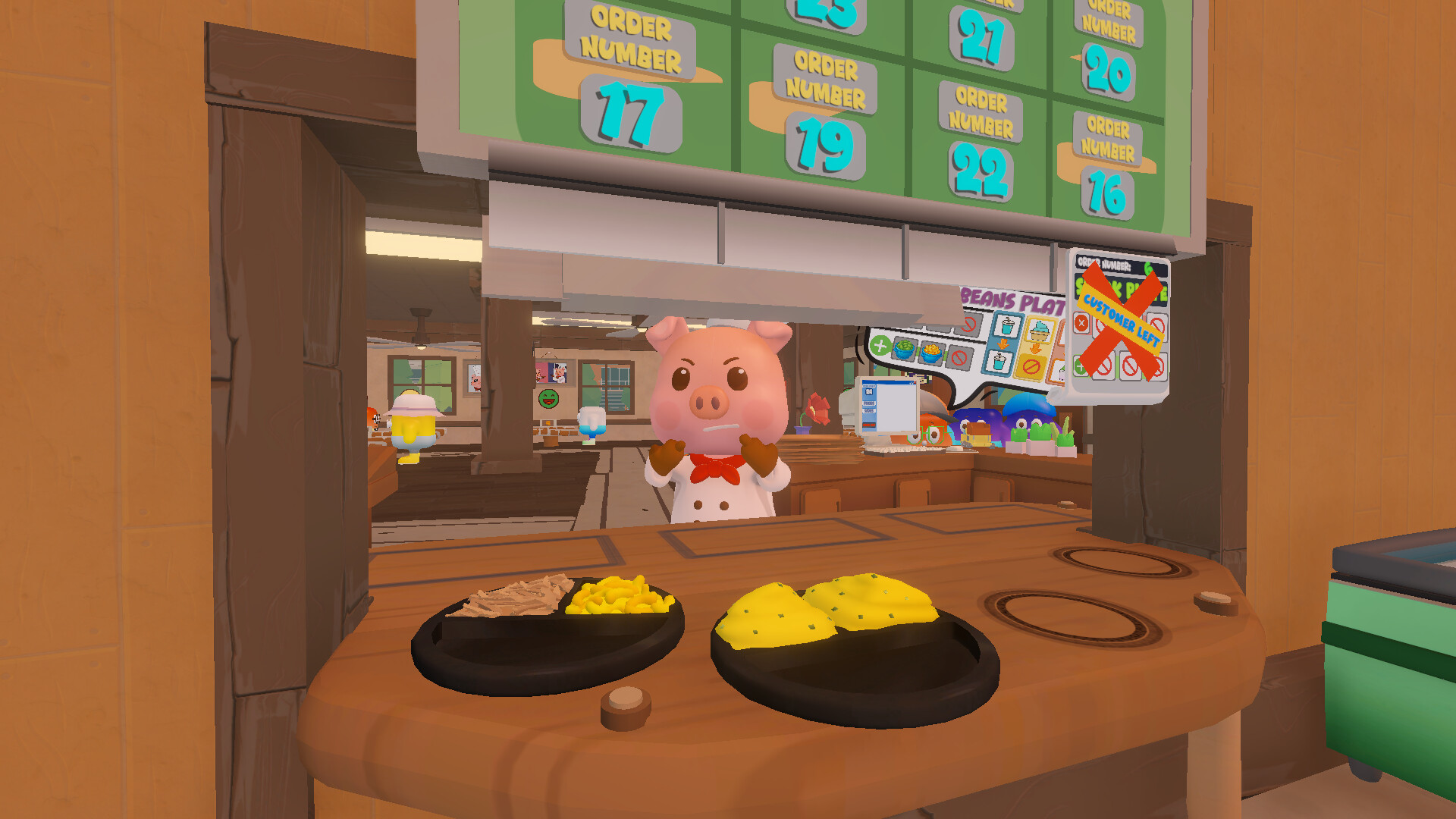 Each day, you and your partner swap roles — one Piggie cooks in the kitchen, the other serves customers out front.