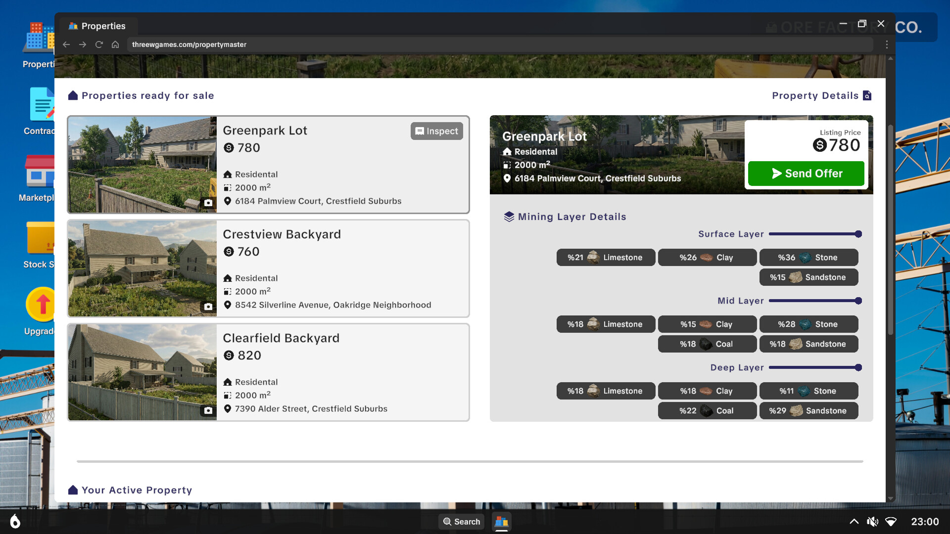 • Property system with multiple types, each featuring randomized ore distribution and profit potential