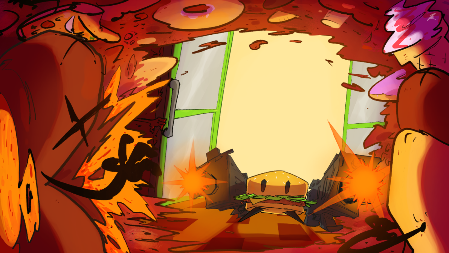 Fast Food War is a bullet hell dungeon crawler following a burger seeking to shoot, dash, cook, destroy enemy fast foods that stops him from reclaiming burger restaurants that has been overtaken by other fast foods.