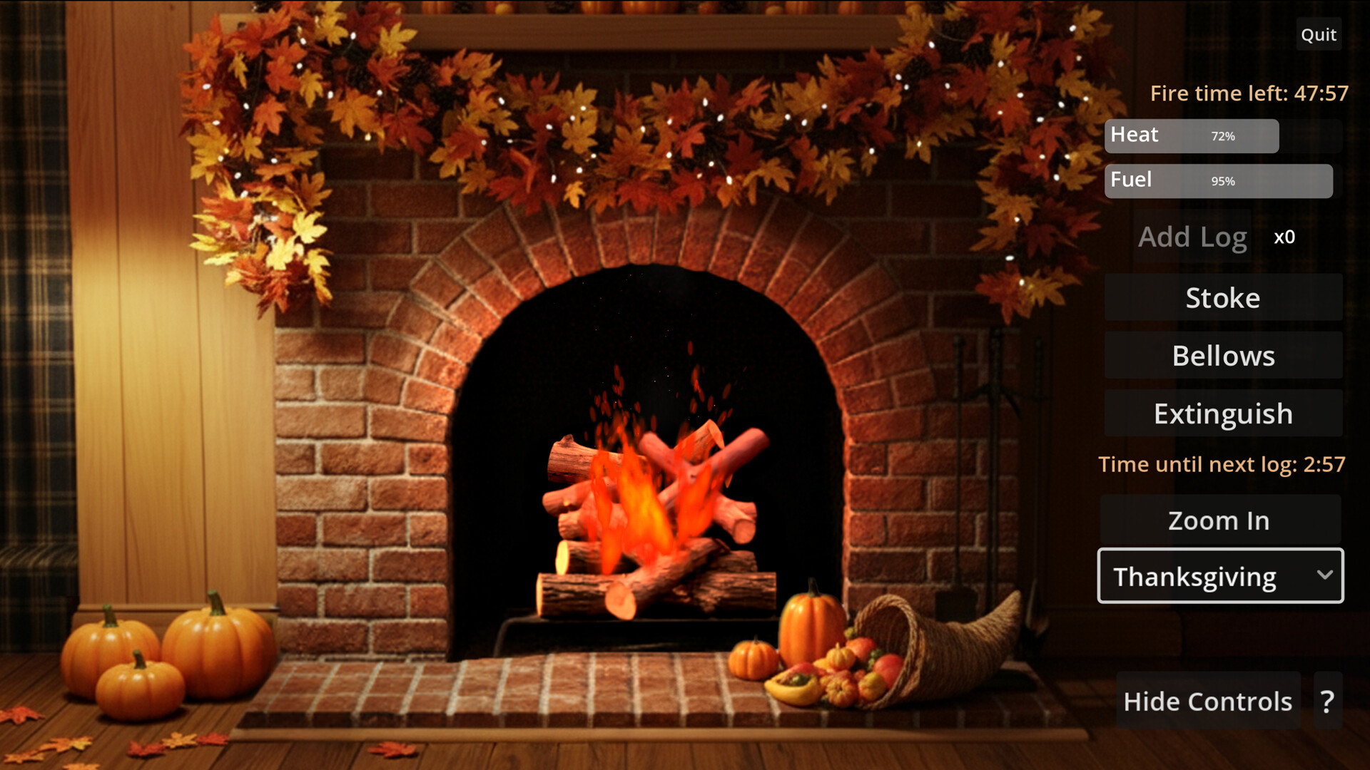It's a game where you can build a cozy fire. You can add logs, kindling, stoke it, use bellows (the accordion looking thing), and more. There are also cute themes for different holidays. You can even extinguish it. (Whoa, this game is action packed!) Put it on your TV or your second monitor at work. It's an interactive fireplace. You get it.