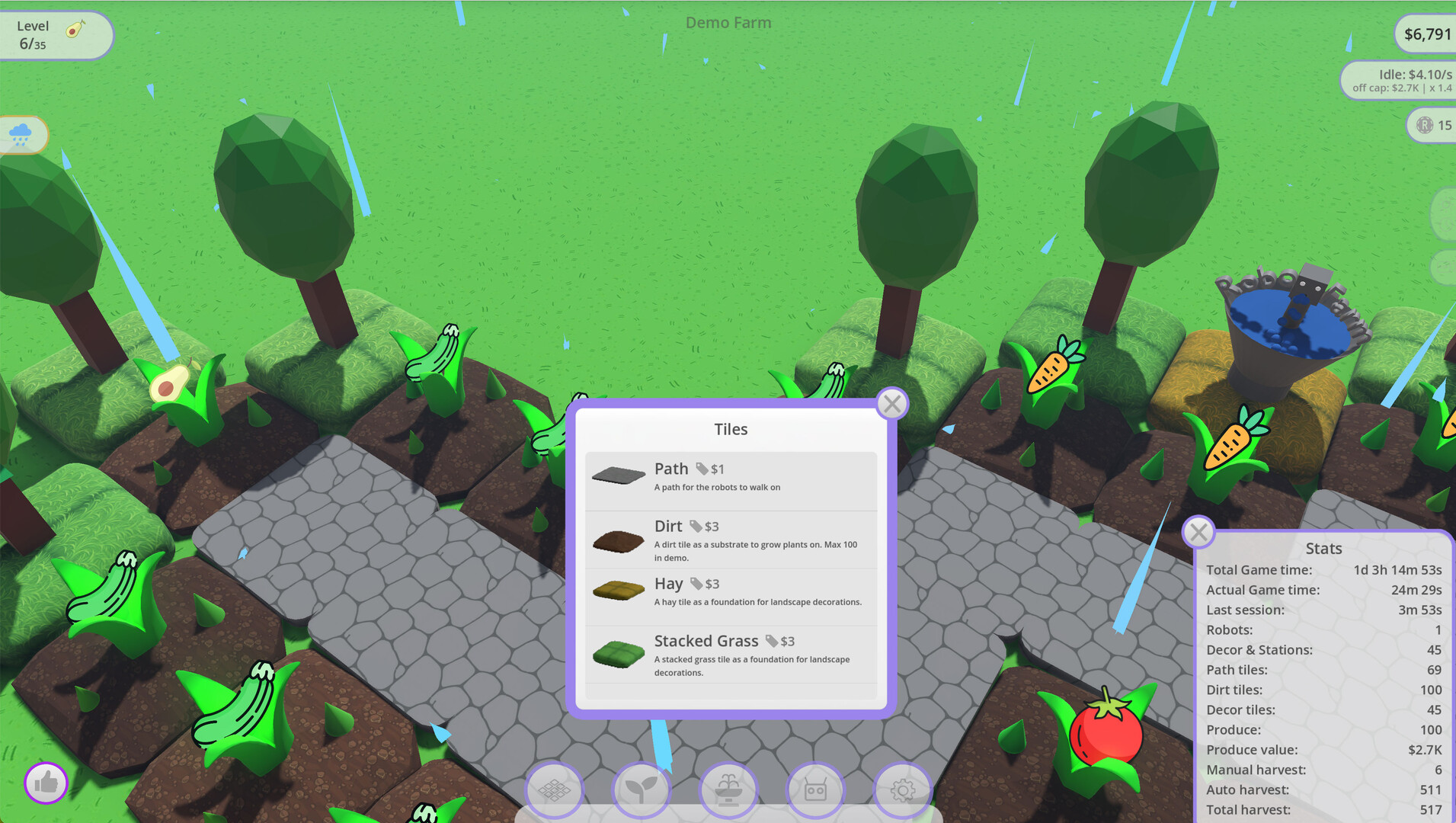 Unlock unique produce, decorate your land with custom creations, and watch your income soar. Use top-down mode to build and design your farm more effectively. With top-down mode, you have a clear view of your farm. Easily construct paths, harvest plants, and enjoy the view. Then upgrade, automate, and keep pushing your farm’s value higher. The demo version limits you to 100 dirt tiles for planting your veggies.
